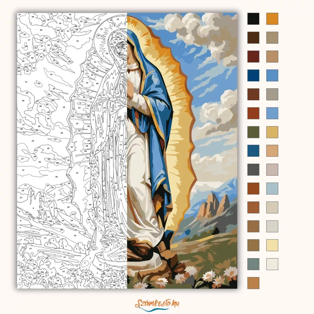 A képen Szűz Mária látható összetett kézzel, fehér ruhában és kék palástban, ragyogó fénykoszorúval körülvéve. A háttérben felhős ég és hegyes táj jelenik meg, az előtérben virágokkal. Nyugodt, áhítatos hangulatú jelenet meleg arany és hűvös égkék árnyalatokkal. Legyen a lakásod dísze vagy egy kedves meglepetés valaki számára – ez a számfestő készlet tökéletes választás mindkettőre. A készletben mindent megtalálsz, amivel lépésről lépésre megalkotható ez a gyönyörű festmény.