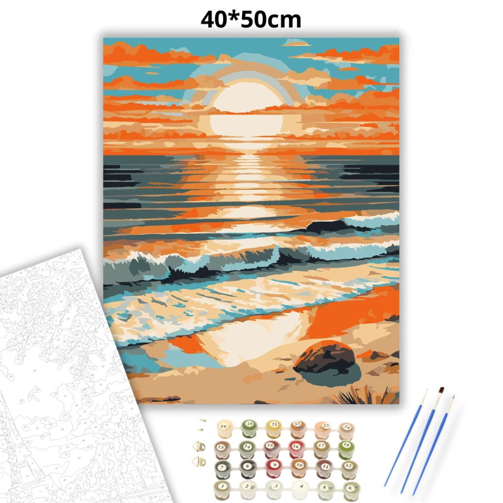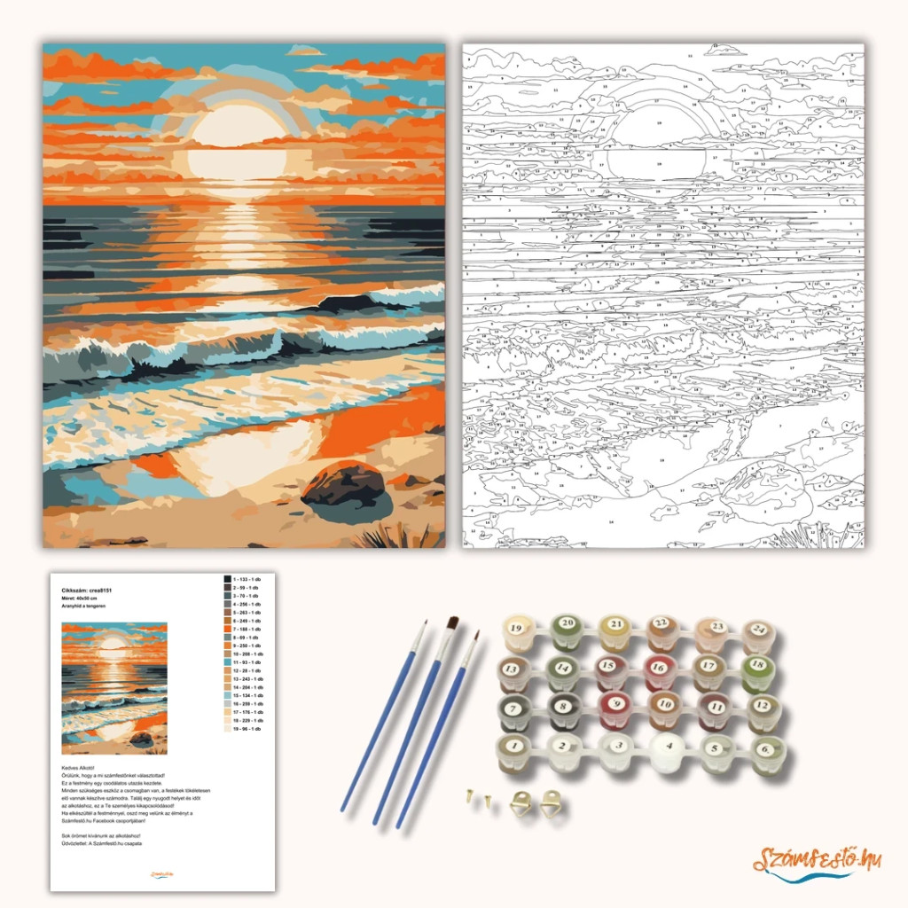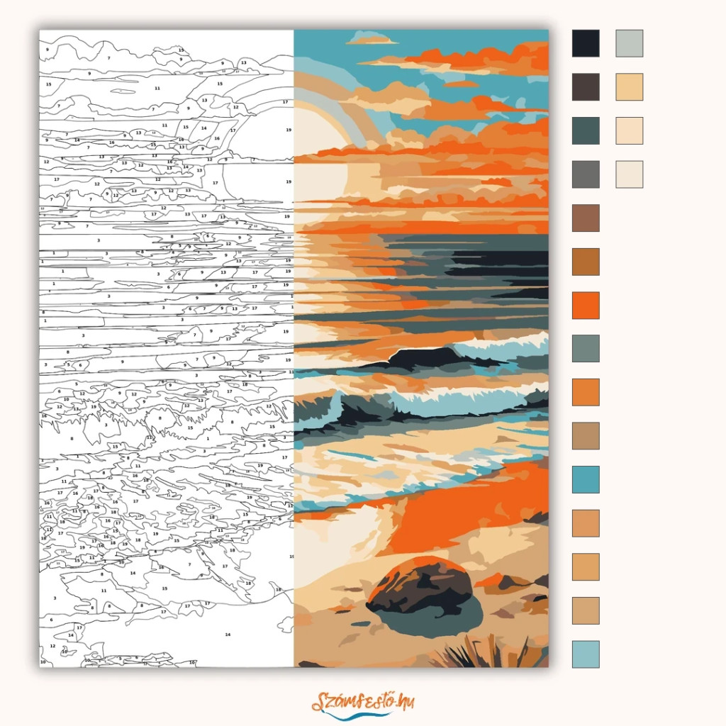 A képen egy tengerpart látható, a horizonton alacsonyan álló nappal és a vízen végigfutó fénycsíkkal. Az égen és a víz felszínén réteges felhők és tükröződések jelennek meg, meleg narancsos és hűvösebb kékes tónusokkal. Elöl hullámok futnak a homokos partra, a parton egy sötét sziklával. Díszítsd otthonodat saját kézzel készített műalkotással, vagy ajándékozd meg szeretteidet egy igazán különleges élménnyel! A számfestő készletben minden szükséges eszköz megtalálható a festmény elkészítéséhez.