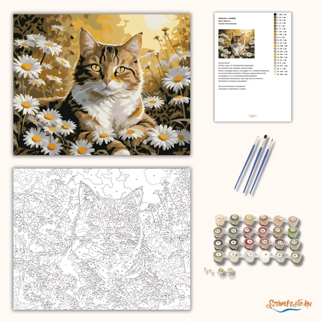 A képen egy cirmos macska látható, margaréták között fekve. A háttérben meleg, napfényes hatású árnyalatok dominálnak. Nyugodt, kedves hangulatú jelenet, sok virággal körülvéve. Varázsolj egyedi hangulatot otthonodba ezzel a gyönyörű számfestő készlettel, amely tökéletes ajándék is lehet szeretteid számára. A csomag mindent tartalmaz, amire szükséged van ahhoz, hogy saját kezűleg alkoss egy lenyűgöző festményt.