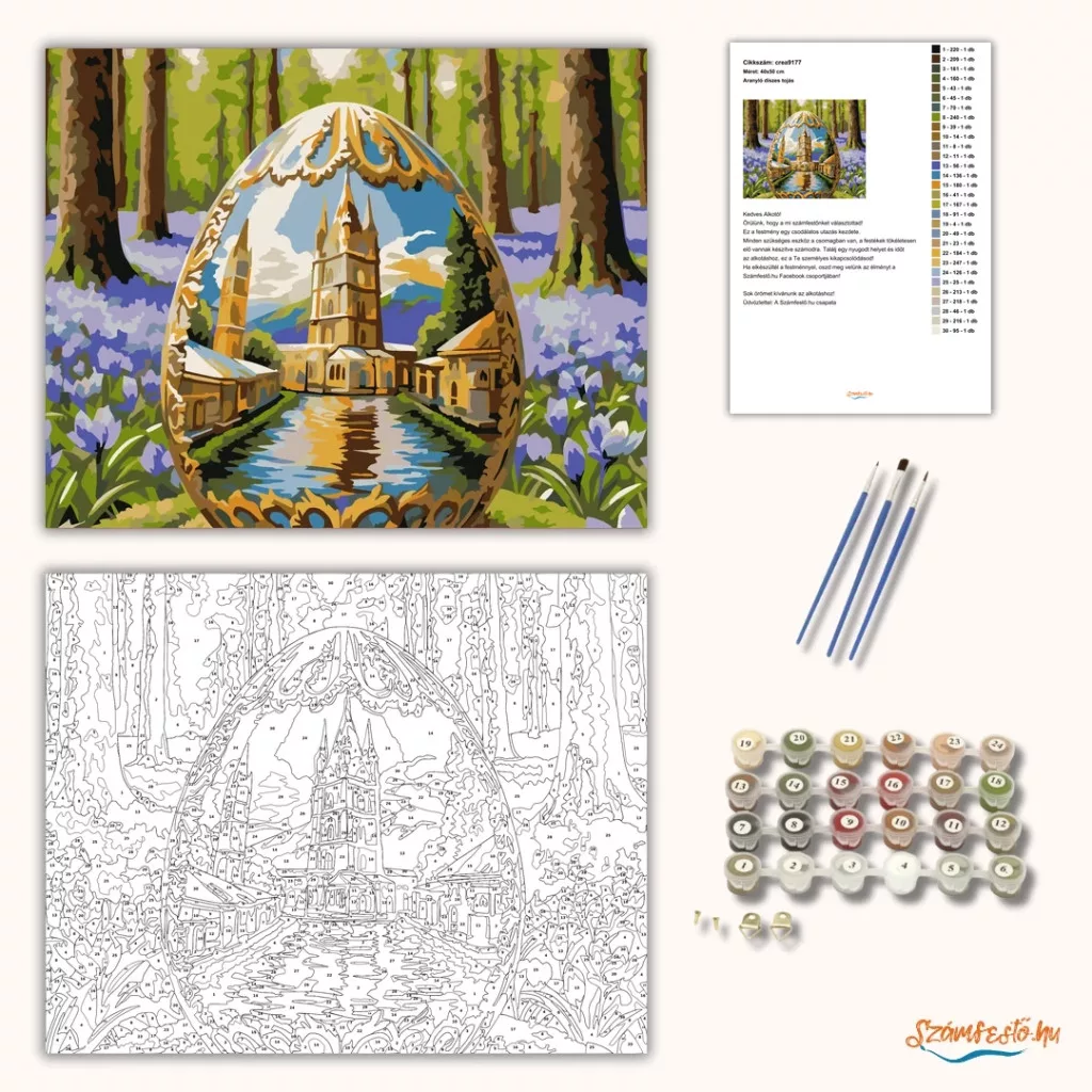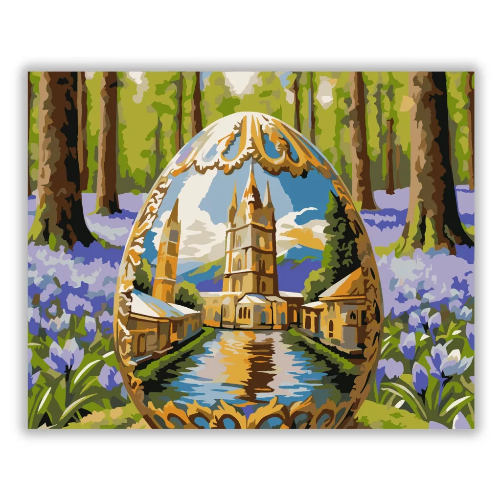 A képen egy díszes húsvéti tojás látható, amelynek belsejében egy tornyos templom és a hozzá vezető vízfelület tükröződése jelenik meg. A tojást erdei háttér és lila virágok veszik körül, friss tavaszi hangulatot teremtve. A meleg arany díszítés és a hűvös égbolt együtt különleges, mesés látványt ad. Varázsolj egyedi hangulatot otthonodba ezzel a gyönyörű számfestő készlettel, amely tökéletes ajándék is lehet szeretteid számára. A csomag mindent tartalmaz, amire szükséged van ahhoz, hogy saját kezűleg alkoss egy lenyűgöző festményt.