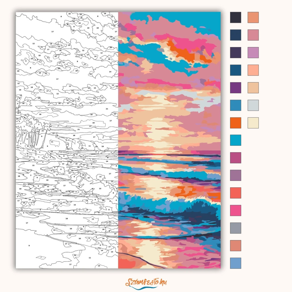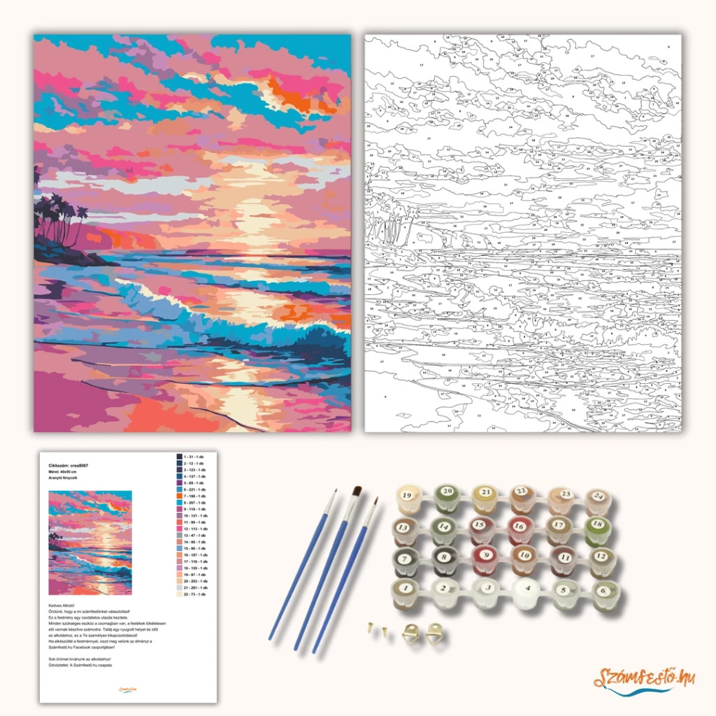 A képen egy tengerpart látható, a vízen fénycsík tükröződik a horizont felől. A felhős ég rózsaszínes és narancsos árnyalatokban izzik, a hullámok pedig élénk, kontrasztos színekkel jelennek meg. Bal oldalt pálmafák sziluettje rajzolódik ki a part mentén, ami nyugodt, nyaralós hangulatot ad a látványnak. Legyen a lakásod dísze vagy egy kedves meglepetés valaki számára – ez a számfestő készlet tökéletes választás mindkettőre. A készletben mindent megtalálsz, amivel lépésről lépésre megalkotható ez a gyönyörű festmény.