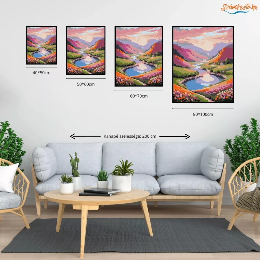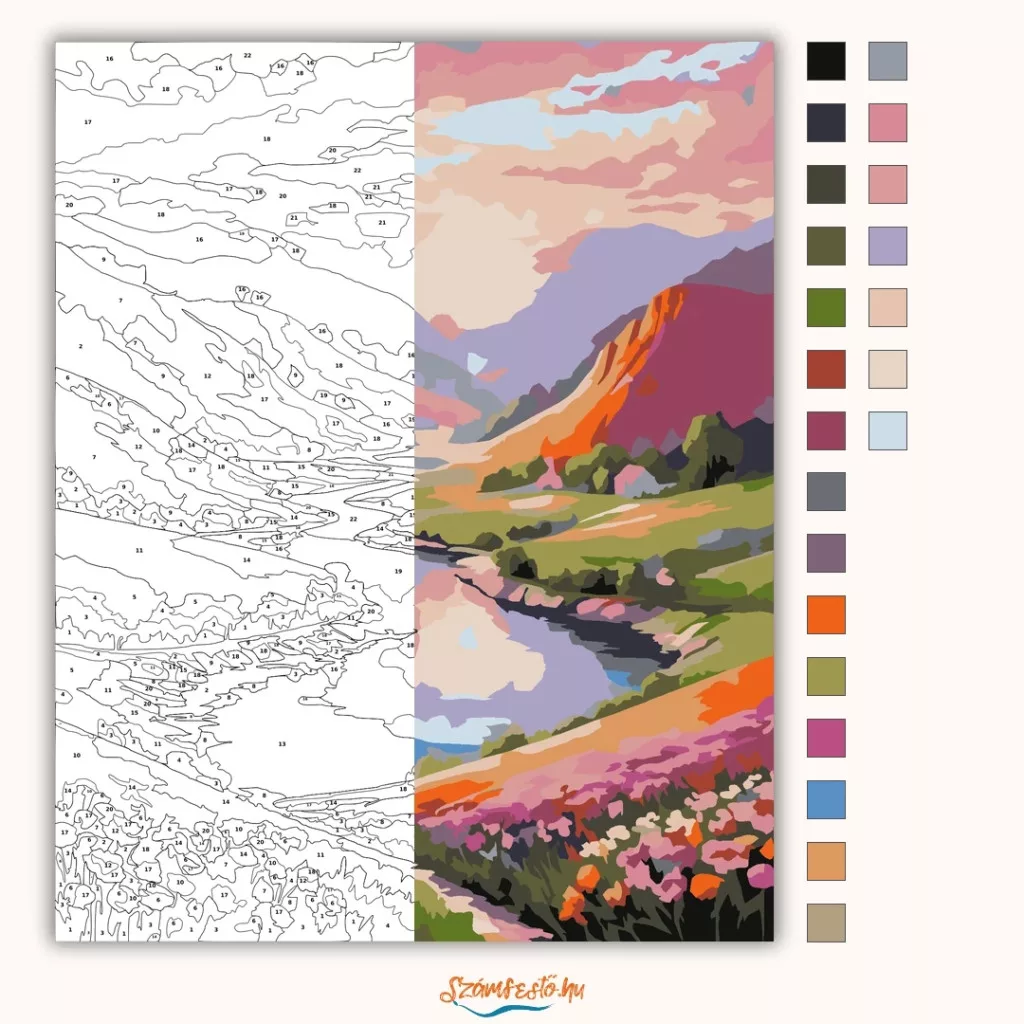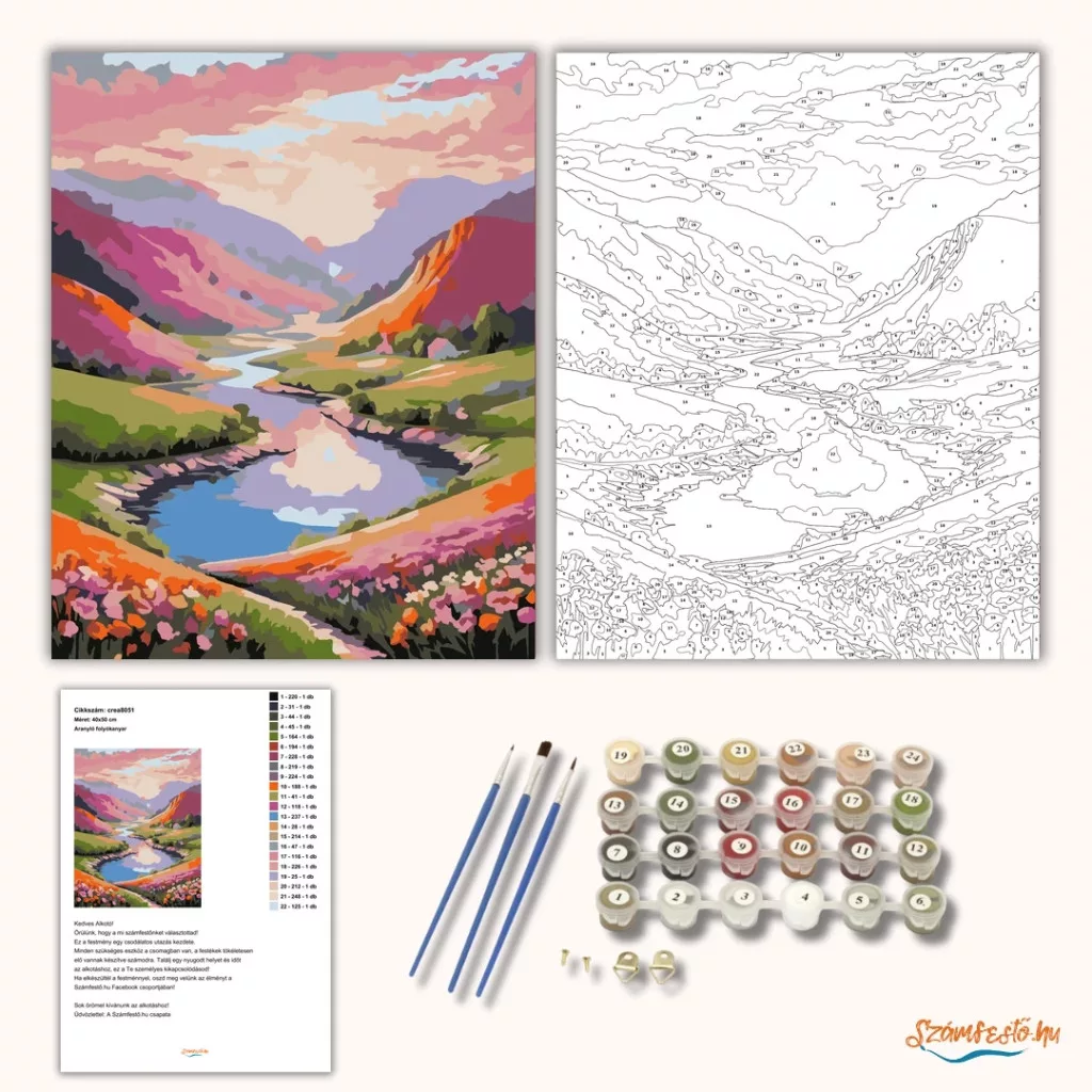 A képen egy hegyekkel körülölelt völgy látható, közepén kanyargó folyóval és egy nyugodt tóval. Az égbolton nagy, puha felhők úsznak, a tájat pedig élénk, meleg tónusok teszik látványossá. Az előtérben virágos rét és egy keskeny ösvény vezeti a tekintetet a víz felé. Ez a számfestő készlet tökéletes választás, ha egyedi dekorációval tennéd szebbé otthonodat, vagy ha különleges ajándékot keresel. A csomagban minden megtalálható, amire a festéshez szükséged van.