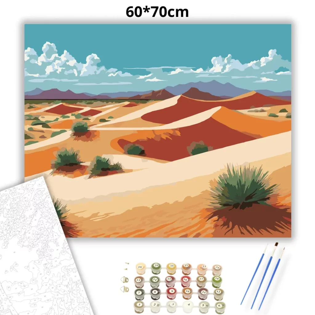 A képen szivárványszerű árnyalatokban hullámzó homokdűnék láthatók, a távolban hegyvonulattal. A türkiz ég alatt fehér felhők úsznak, a dűnék között pedig elszórtan sivatagi bokrok jelennek meg. Meleg, napfényes hangulatú tájkép, látványos színátmenetekkel. Varázsolj egyedi hangulatot otthonodba ezzel a gyönyörű számfestő készlettel, amely tökéletes ajándék is lehet szeretteid számára. A csomag mindent tartalmaz, amire szükséged van ahhoz, hogy saját kezűleg alkoss egy lenyűgöző festményt.