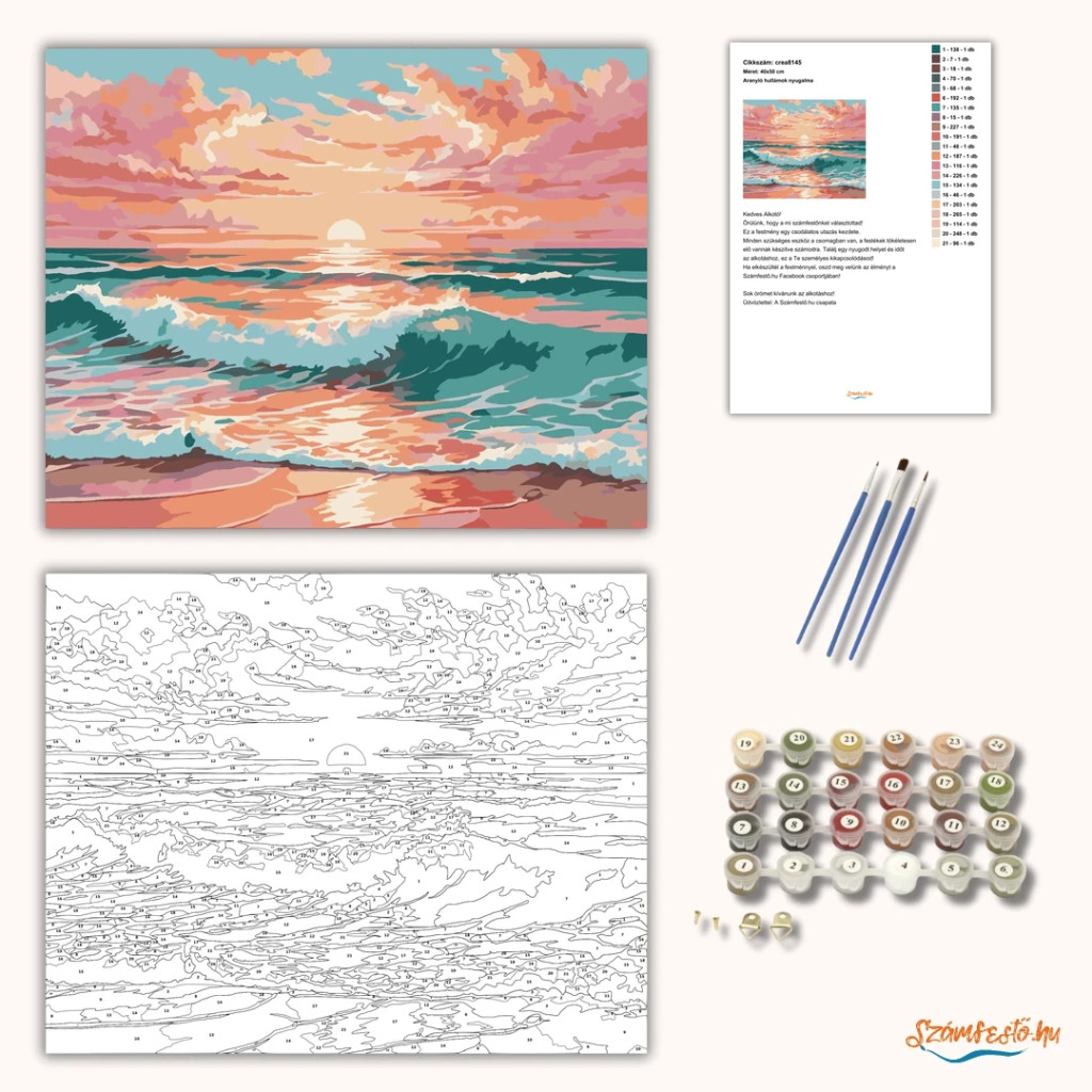 A képen a tenger hullámai láthatók a part közelében, a vízen visszatükröződő fénnyel. A horizonton egy alacsonyan álló nap jelenik meg, felette felhős égbolttal. A látvány nyugodt, álomszerű hangulatot kelt. Varázsolj egyedi hangulatot otthonodba ezzel a gyönyörű számfestő készlettel, amely tökéletes ajándék is lehet szeretteid számára. A csomag mindent tartalmaz, amire szükséged van ahhoz, hogy saját kezűleg alkoss egy lenyűgöző festményt.