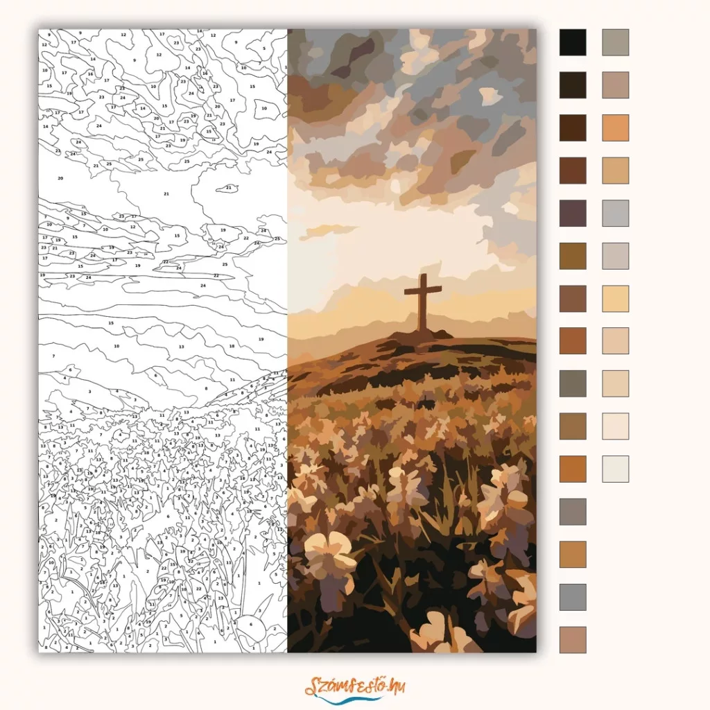 A képen egy dombtetőn álló kereszt látható, mögötte hegyekkel és tágas, felhős éggel. Az előtérben sok vadvirág borítja a mezőt, a fény pedig meleg, napfelkeltére emlékeztető hangulatot ad. Békés, elcsendesedős látvány, amely jól mutat otthon és ajándéknak is. Engedd szabadjára a kreativitásodat, és alkoss egy különleges műalkotást, amely otthonod dísze lehet de egyedi ajándékként is kiváló. A számfestő készletben minden szükséges eszközt megtalálsz a tökéletes végeredményhez.