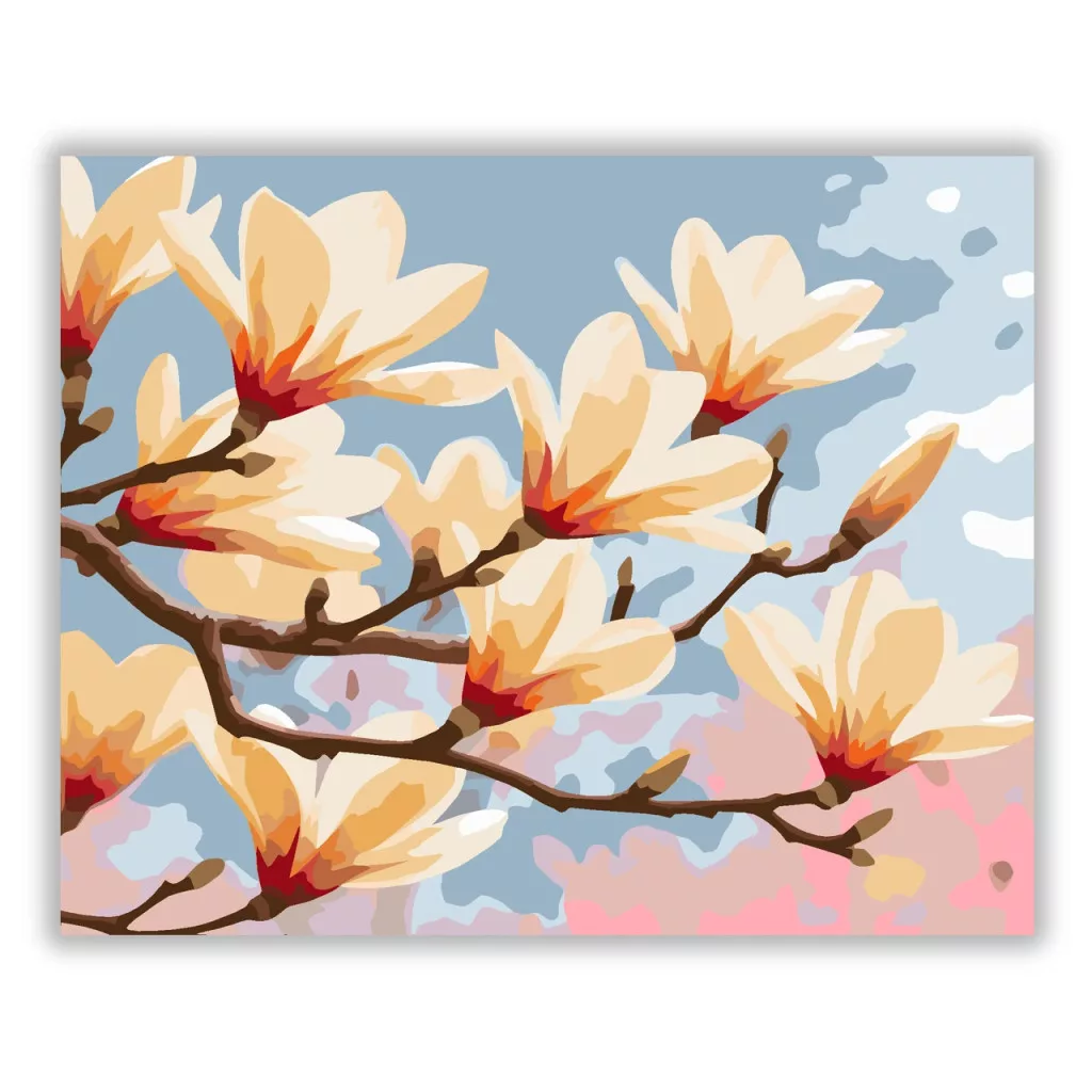 A képen tavaszi magnóliaágak láthatók, nagy, krémszínű virágokkal és néhány bimbóval. A világos égbolt előtt a meleg, narancsos középrészű szirmok barátságos, friss hangulatot adnak. Otthonodba üde, természetközeli látványt hoz. Varázsolj egyedi hangulatot otthonodba ezzel a gyönyörű számfestő készlettel, amely tökéletes ajándék is lehet szeretteid számára. A csomag mindent tartalmaz, amire szükséged van ahhoz, hogy saját kezűleg alkoss egy lenyűgöző festményt.