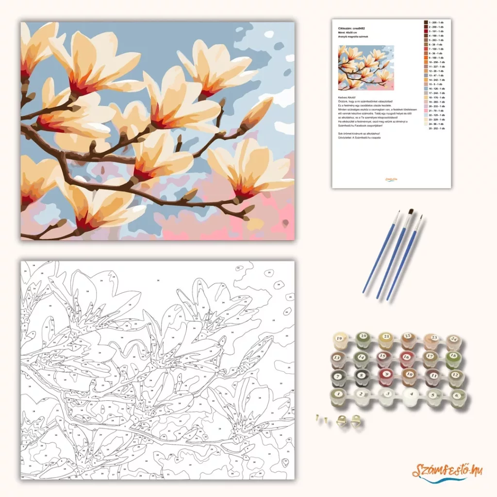 A képen tavaszi magnóliaágak láthatók, nagy, krémszínű virágokkal és néhány bimbóval. A világos égbolt előtt a meleg, narancsos középrészű szirmok barátságos, friss hangulatot adnak. Otthonodba üde, természetközeli látványt hoz. Engedd szabadjára a kreativitásodat, és alkoss egy különleges műalkotást, amely otthonod dísze lehet de egyedi ajándékként is kiváló. A számfestő készletben minden szükséges eszközt megtalálsz a tökéletes végeredményhez.