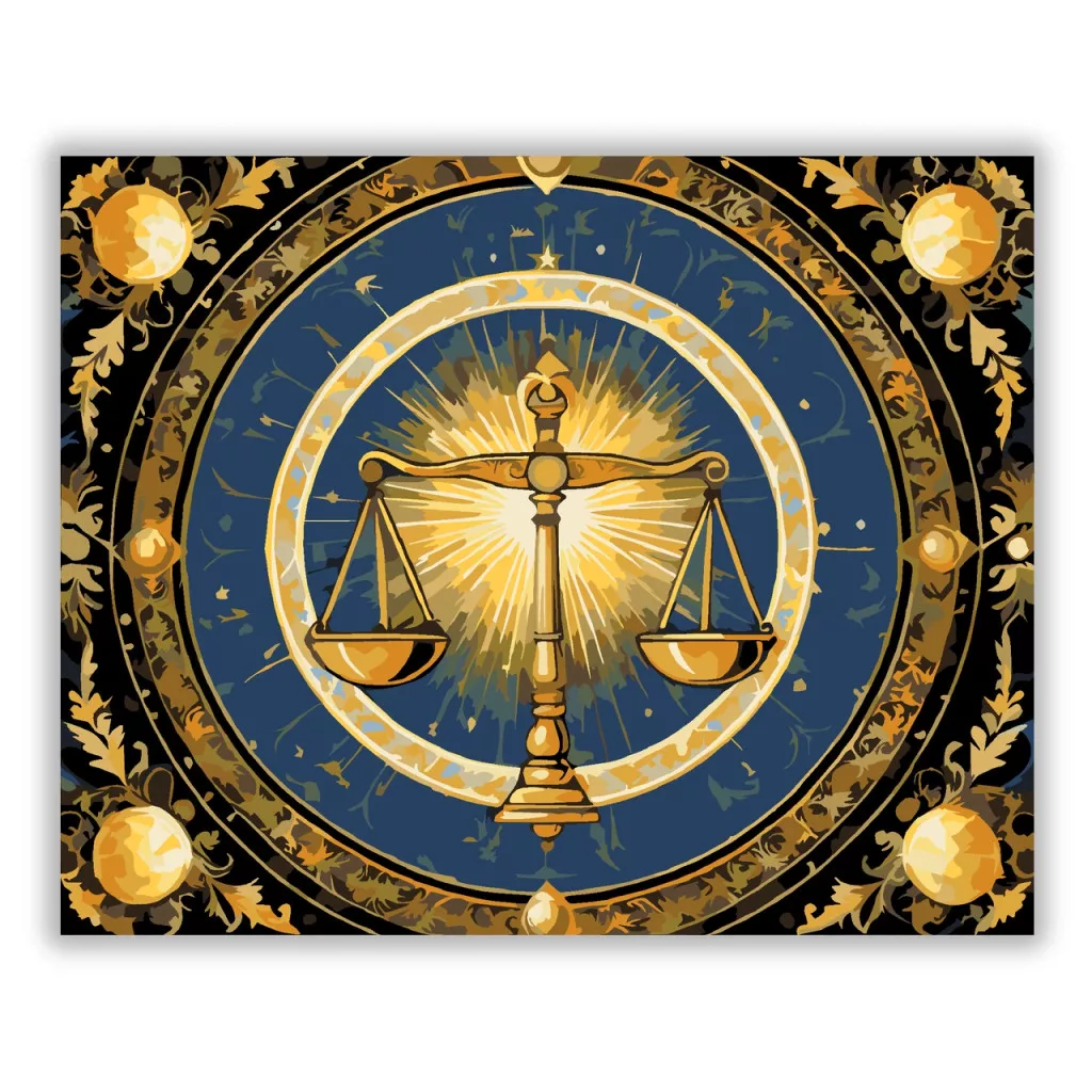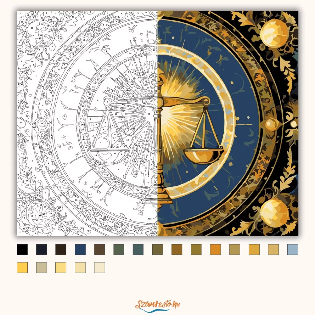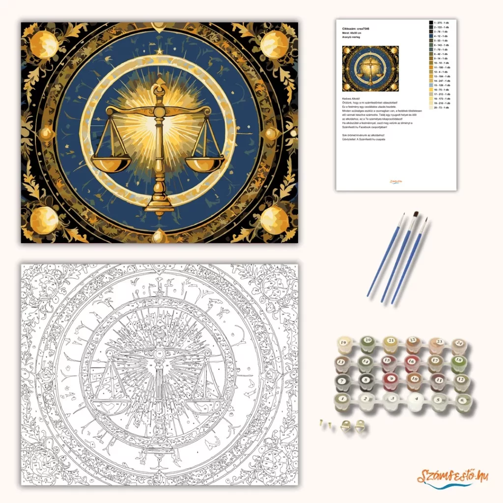 A képen a Mérleg csillagjegy jelképe látható: egy aranyszínű mérleg, amely egy ragyogó fényudvar közepén áll. A sötétkék háttérben apró csillagok és körben elhelyezett zodiákus szimbólumok jelennek meg. A díszes, arany ornamentika ünnepélyes, elegáns hangulatot ad a képnek. Engedd szabadjára a kreativitásodat, és alkoss egy különleges műalkotást, amely otthonod dísze lehet de egyedi ajándékként is kiváló. A számfestő készletben minden szükséges eszközt megtalálsz a tökéletes végeredményhez.