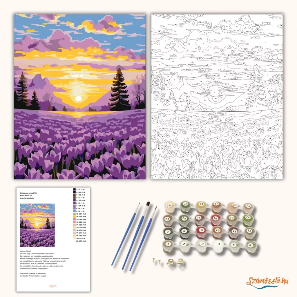 A képen napfelkelte látható egy hegyekkel ölelt táj fölött, arany fényben úszó felhőkkel. Az előtérben lila krókuszmező terül el, amely a horizont felé vezet. Nyugodt, tavaszi hangulatot áraszt, friss és derűs színekkel. Engedd szabadjára a kreativitásodat, és alkoss egy különleges műalkotást, amely otthonod dísze lehet de egyedi ajándékként is kiváló. A számfestő készletben minden szükséges eszközt megtalálsz a tökéletes végeredményhez.