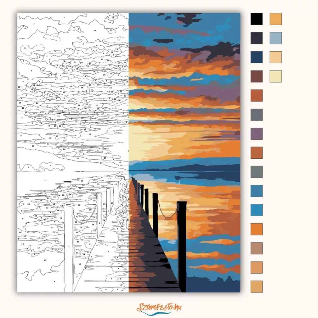 A képen egy hosszú stég nyúlik be a nyugodt vízbe, két oldalt oszlopokkal és kötelekkel. A horizont felett a nap alacsonyan áll, fénye aranylóan tükröződik a vízfelszínen. Az ég látványos, réteges felhőkkel teli, meleg és hűvös árnyalatok váltakozásával. Ez a számfestő készlet tökéletes választás, ha egyedi dekorációval tennéd szebbé otthonodat, vagy ha különleges ajándékot keresel. A csomagban minden megtalálható, amire a festéshez szükséged van.