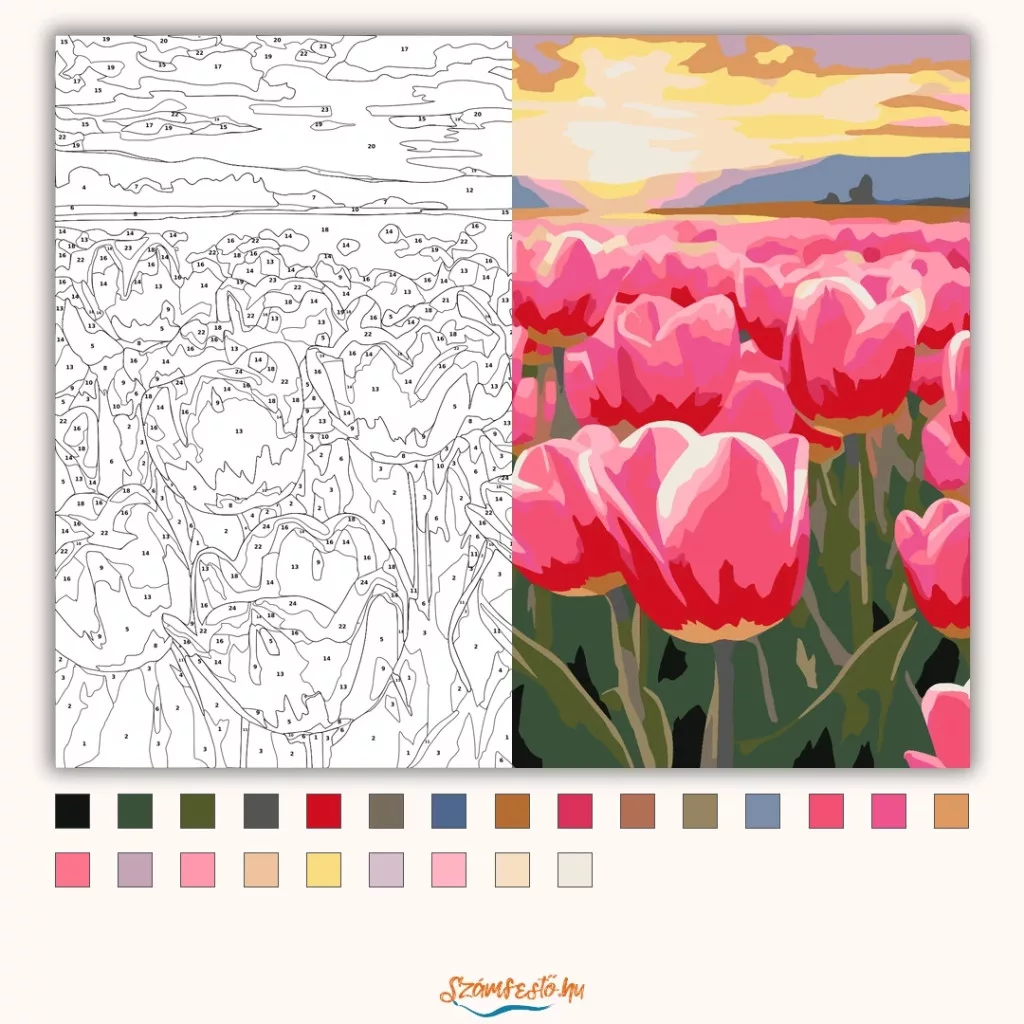 A képen egy hatalmas, virágzó tulipánmező látható, tele rózsaszín és piros tulipánokkal. A háttérben hegyek és egy felkelő nap dereng, a felhős ég aranyos fényben úszik. Friss, tavaszias hangulatot áraszt, ami azonnal feldobja a teret. Ez a számfestő készlet tökéletes választás, ha egyedi dekorációval tennéd szebbé otthonodat, vagy ha különleges ajándékot keresel. A csomagban minden megtalálható, amire a festéshez szükséged van.