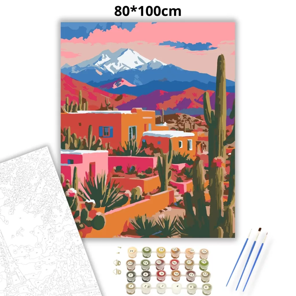 A képen színes, lapostetős vályogházak láthatók egy sivatagos tájban, körülöttük magas kaktuszokkal és pozsgás növényekkel. A háttérben hófödte hegycsúcsok emelkednek, felettük narancsos-rózsaszín égbolttal. Az összhatás meleg, utazós hangulatot áraszt, tele élénk részletekkel. Varázsolj egyedi hangulatot otthonodba ezzel a gyönyörű számfestő készlettel, amely tökéletes ajándék is lehet szeretteid számára. A csomag mindent tartalmaz, amire szükséged van ahhoz, hogy saját kezűleg alkoss egy lenyűgöző festményt.