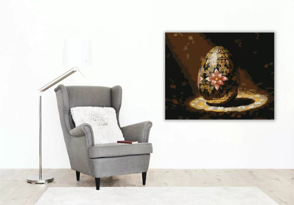 A képen egy díszes, virágmintás tojás látható egy kis tartón, sötét háttér előtt. A tojás felületén aranyozott díszítések és egy nagy virágmotívum emelkedik ki. A kép hangulata elegáns és ünnepi, meleg, mély árnyalatokkal. Varázsolj egyedi hangulatot otthonodba ezzel a gyönyörű számfestő készlettel, amely tökéletes ajándék is lehet szeretteid számára. A csomag mindent tartalmaz, amire szükséged van ahhoz, hogy saját kezűleg alkoss egy lenyűgöző festményt.