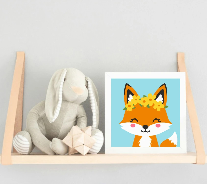 A képen egy mosolygós rókácska látható, a fején sárga virágkoszorúval. Az élénk narancssárga bunda, a fehér pofi és a rózsaszín pír szépen kiemelkedik a világoskék háttérből. Vidám, egyszerű forma, amit könnyű kiszínezni. Engedd szabadjára a kreativitásodat, és alkoss egy különleges műalkotást, amely otthonod dísze lehet de egyedi ajándékként is kiváló. A számfestő készletben minden szükséges eszközt megtalálsz a tökéletes végeredményhez.