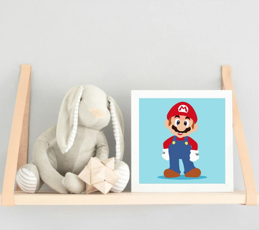 A képen egy bajuszos, vidám figura áll piros sapkában és kék kantáros nadrágban. Fehér kesztyűt és barna cipőt visel, a háttér pedig világoskék. Remek választás kis művészeknek, akik szeretik a hősies kalandokat!