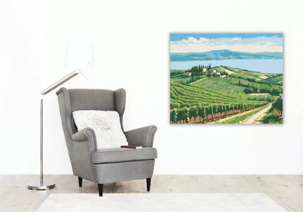 A képen dombos táj látható szőlősorokkal és néhány házzal a dombtetőn. A háttérben egy nagy tó terül el, fölötte felhős ég és távoli hegyek. Nyugodt, tágas hangulatú látvány, sok zöld árnyalattal és világos kék tónusokkal. Ez a számfestő készlet tökéletes választás, ha egyedi dekorációval tennéd szebbé otthonodat, vagy ha különleges ajándékot keresel. A csomagban minden megtalálható, amire a festéshez szükséged van.