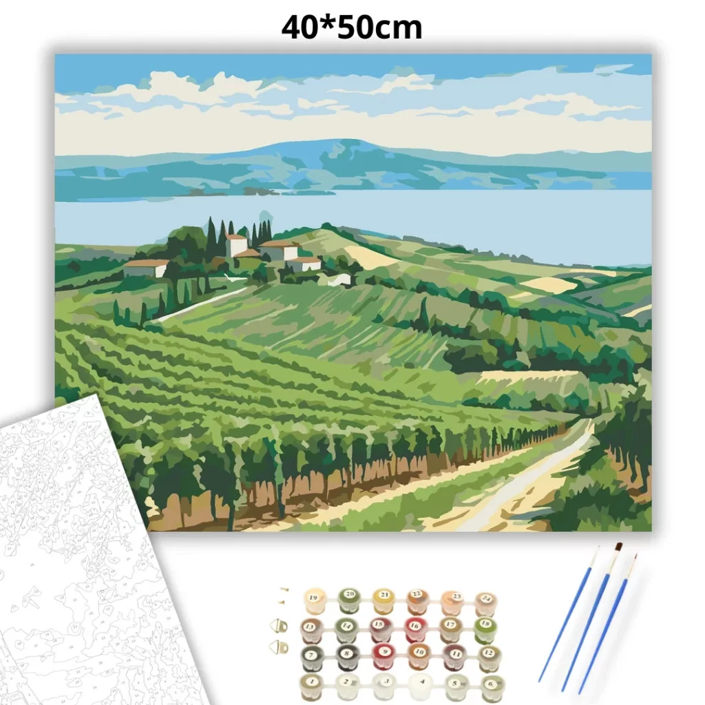 A képen dombos táj látható szőlősorokkal és néhány házzal a dombtetőn. A háttérben egy nagy tó terül el, fölötte felhős ég és távoli hegyek. Nyugodt, tágas hangulatú látvány, sok zöld árnyalattal és világos kék tónusokkal. Legyen a lakásod dísze vagy egy kedves meglepetés valaki számára – ez a számfestő készlet tökéletes választás mindkettőre. A készletben mindent megtalálsz, amivel lépésről lépésre megalkotható ez a gyönyörű festmény.