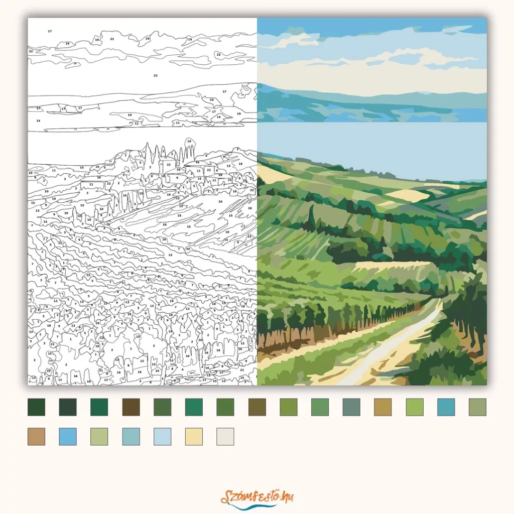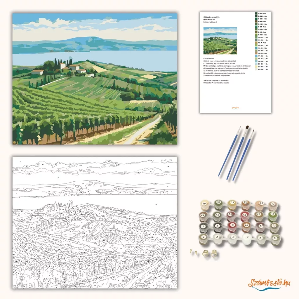 A képen dombos táj látható szőlősorokkal és néhány házzal a dombtetőn. A háttérben egy nagy tó terül el, fölötte felhős ég és távoli hegyek. Nyugodt, tágas hangulatú látvány, sok zöld árnyalattal és világos kék tónusokkal. Legyen a lakásod dísze vagy egy kedves meglepetés valaki számára – ez a számfestő készlet tökéletes választás mindkettőre. A készletben mindent megtalálsz, amivel lépésről lépésre megalkotható ez a gyönyörű festmény.