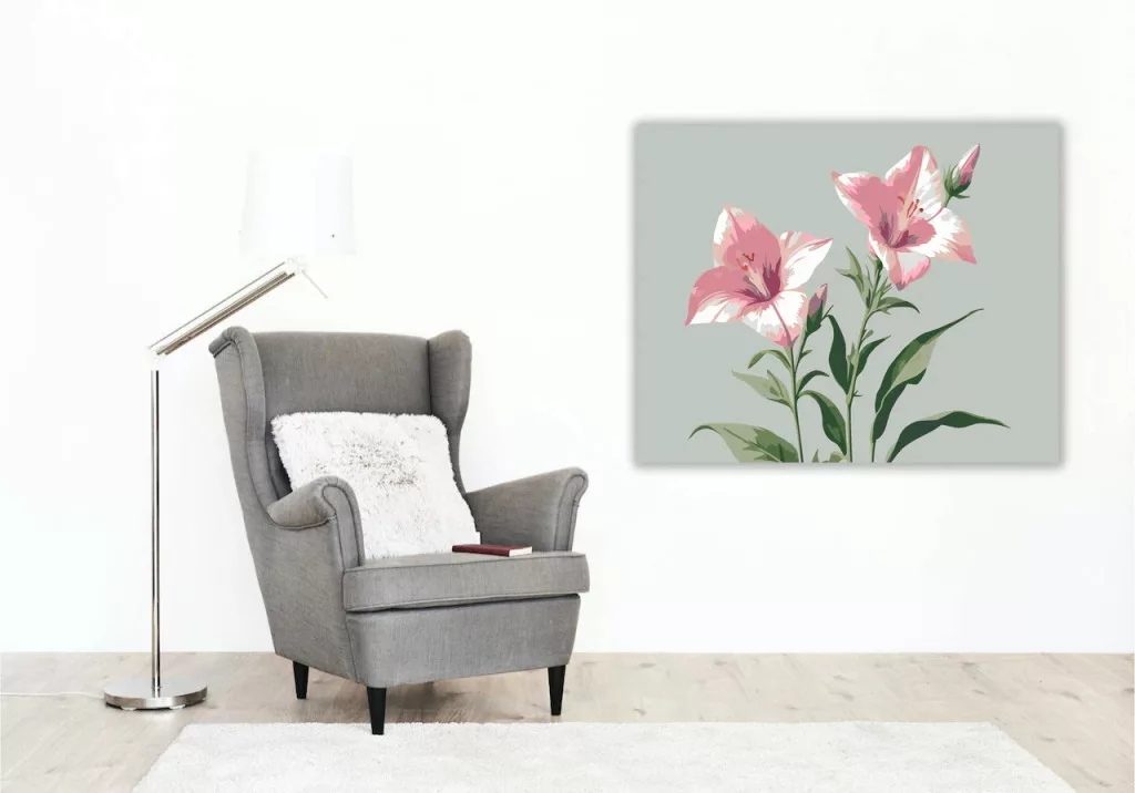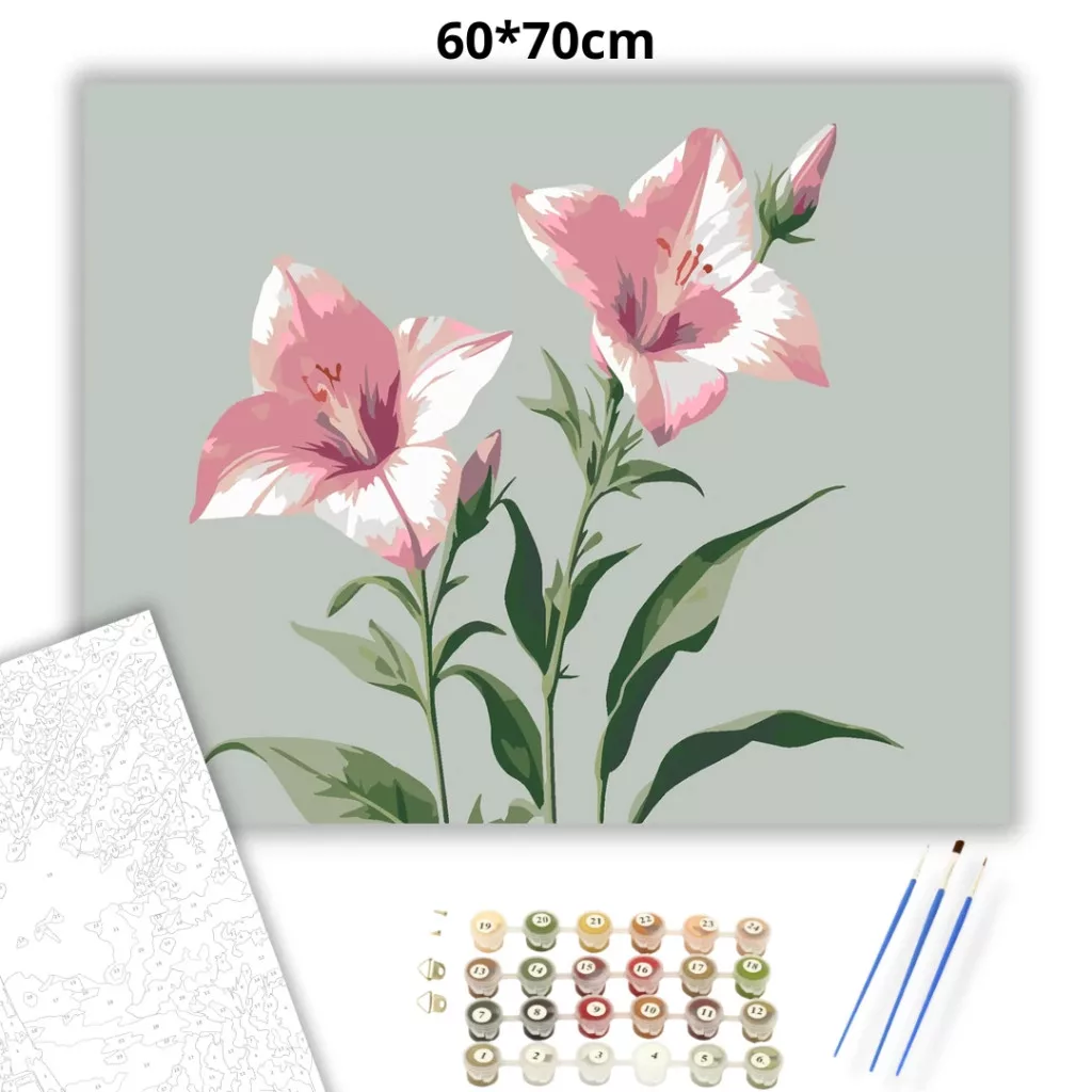 A képen két rózsaszín, harang alakú virág látható hosszú száron, zöld levelekkel és két bimbóval. A világos háttér és a finom árnyalatok nyugodt, letisztult hangulatot adnak. Szép választás, ha virágos, könnyed képet szeretnél a falra. Díszítsd otthonodat saját kézzel készített műalkotással, vagy ajándékozd meg szeretteidet egy igazán különleges élménnyel! A számfestő készletben minden szükséges eszköz megtalálható a festmény elkészítéséhez.