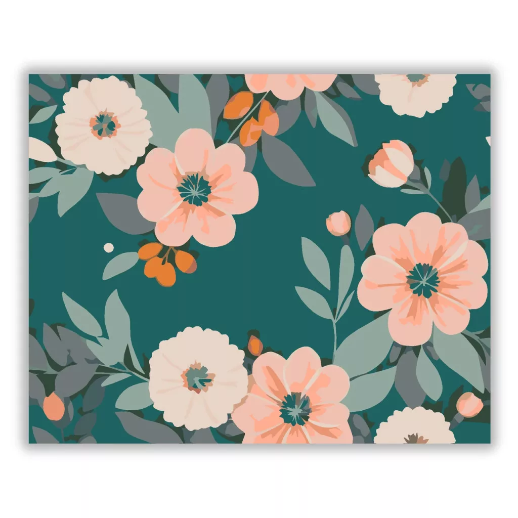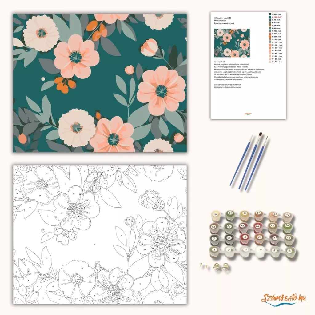 A képen nagy, barackos árnyalatú virágok és krémszínű virágfejek láthatók sötét türkiz háttér előtt, sok zöld levéllel körülvéve. A virágok között apró bimbók és kis termések is megjelennek. Friss, nyugodt, természetközeli hangulatú minta, ami otthonos dísz lehet bármelyik falon. Varázsolj egyedi hangulatot otthonodba ezzel a gyönyörű számfestő készlettel, amely tökéletes ajándék is lehet szeretteid számára. A csomag mindent tartalmaz, amire szükséged van ahhoz, hogy saját kezűleg alkoss egy lenyűgöző festményt.