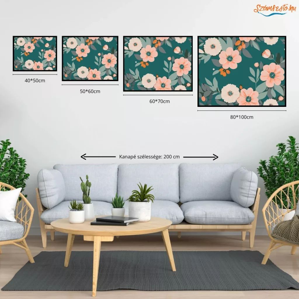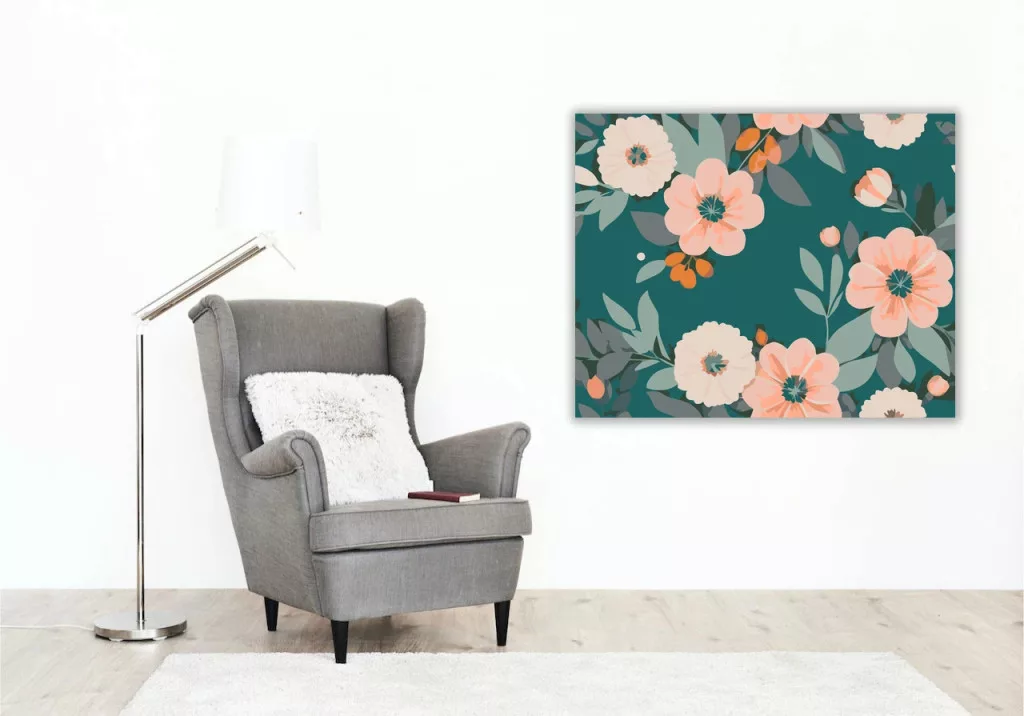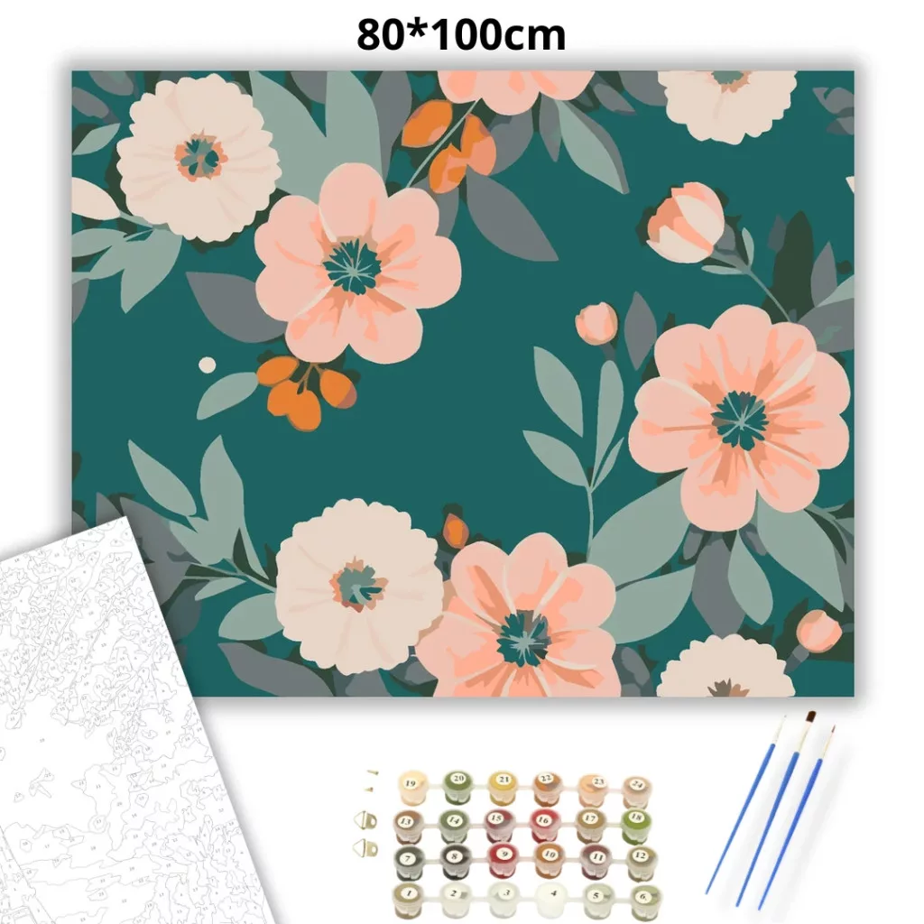A képen nagy, barackos árnyalatú virágok és krémszínű virágfejek láthatók sötét türkiz háttér előtt, sok zöld levéllel körülvéve. A virágok között apró bimbók és kis termések is megjelennek. Friss, nyugodt, természetközeli hangulatú minta, ami otthonos dísz lehet bármelyik falon. Legyen a lakásod dísze vagy egy kedves meglepetés valaki számára – ez a számfestő készlet tökéletes választás mindkettőre. A készletben mindent megtalálsz, amivel lépésről lépésre megalkotható ez a gyönyörű festmény.