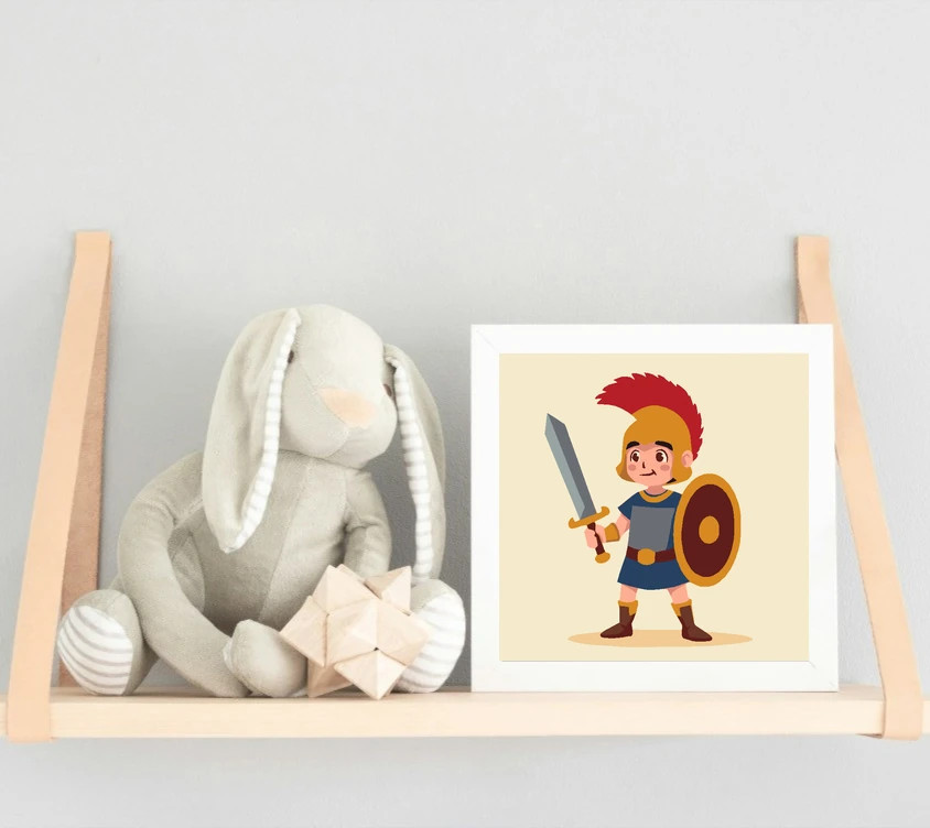 A képen egy bátor kis harcos áll karddal és kerek pajzzsal a kezében. A sisakján piros toll díszlik, ruhája kék, a pajzs pedig barna-arany színekben ragyog. Egyszerű, jól követhető minta a kis festőknek. Varázsolj egyedi hangulatot otthonodba ezzel a gyönyörű számfestő készlettel, amely tökéletes ajándék is lehet szeretteid számára. A csomag mindent tartalmaz, amire szükséged van ahhoz, hogy saját kezűleg alkoss egy lenyűgöző festményt.