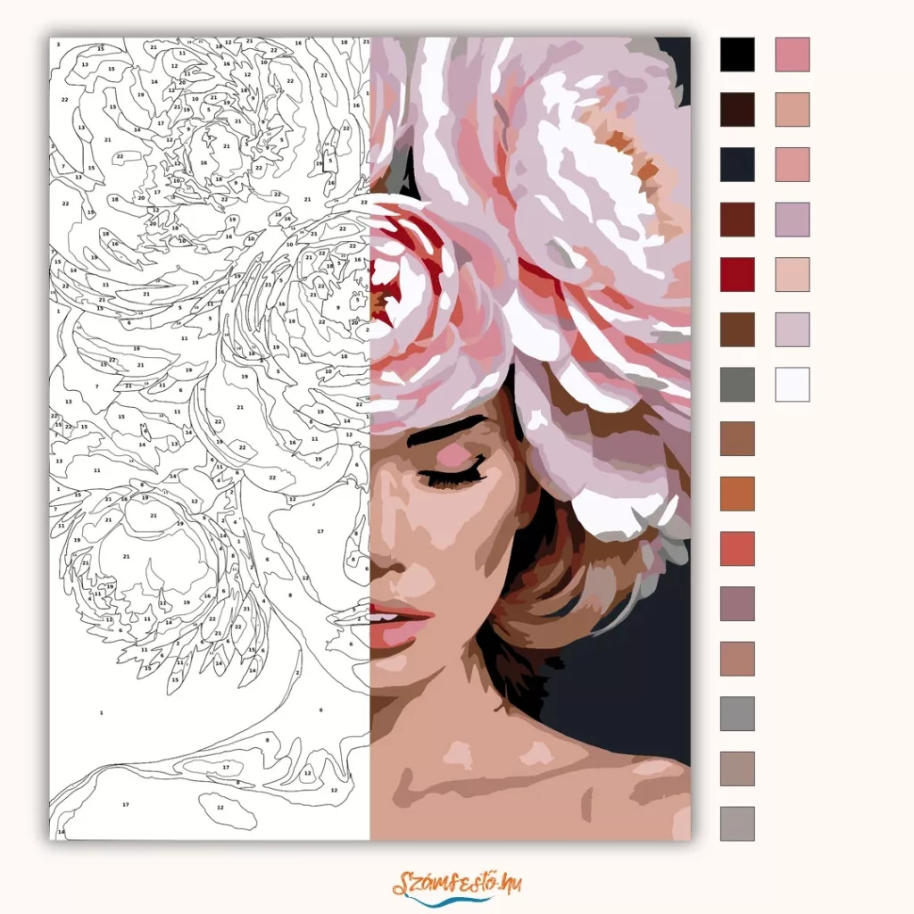 A képen egy női arc látható, akinek a fejét nagy, telt virágok borítják. A virágok részben eltakarják az egyik szemét, a másik szeme le van csukva. A sötét háttér és a lágy rózsaszínes-fehéres árnyalatok nyugodt, álomszerű hangulatot adnak. Ez a számfestő készlet tökéletes választás, ha egyedi dekorációval tennéd szebbé otthonodat, vagy ha különleges ajándékot keresel. A csomagban minden megtalálható, amire a festéshez szükséged van.