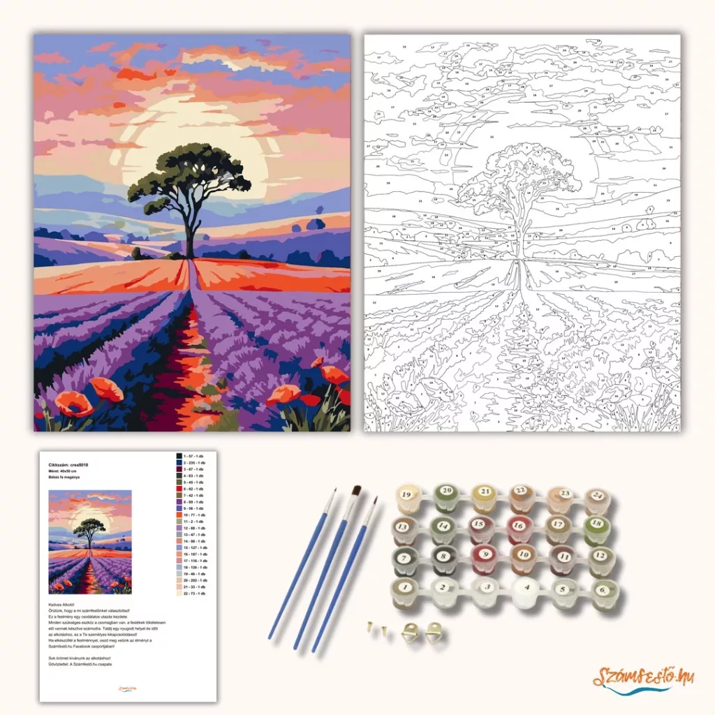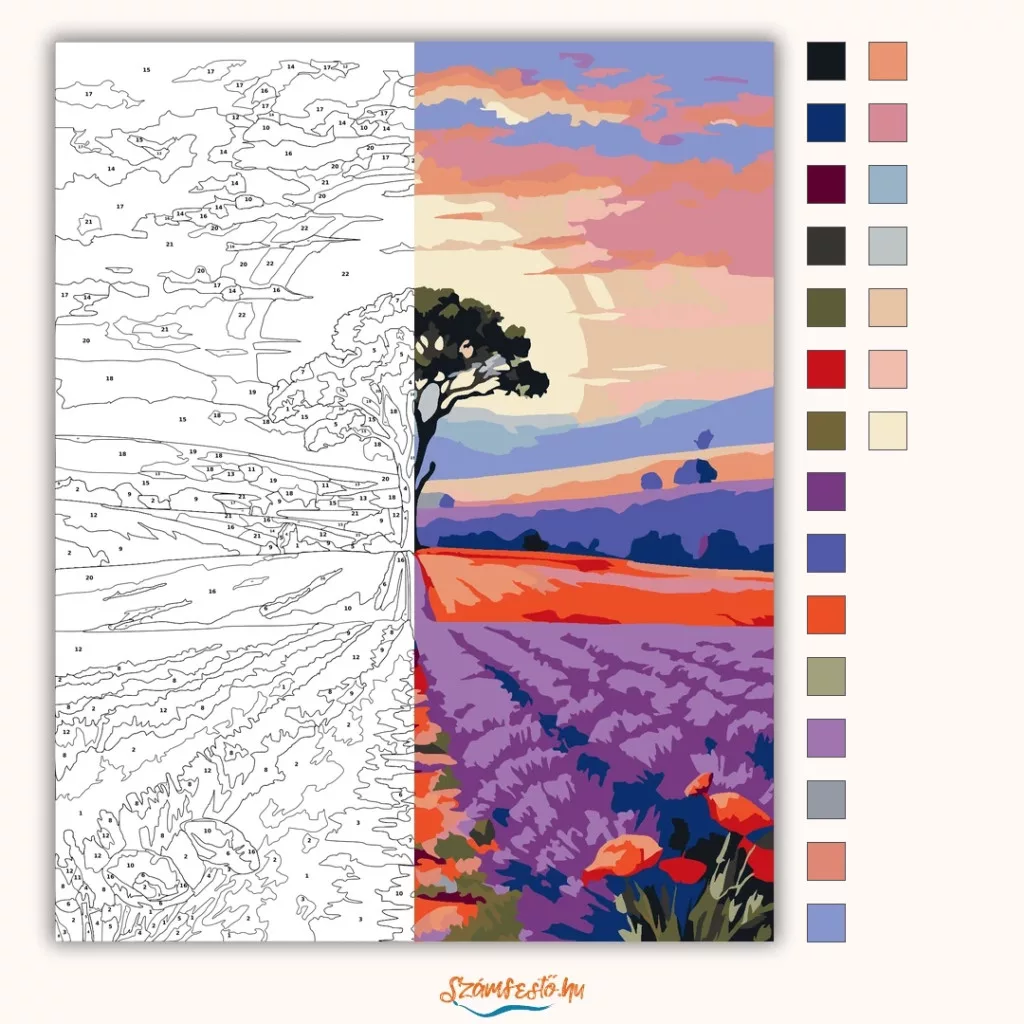 A képen egy levendulamező látható sorokba rendezve, középen egy keskeny ösvénnyel, amely egy magányos fához vezet. A háttérben dombok és egy nagy, alacsonyan álló nap látszik a felhős ég alatt. A lila mezőt élénk pipacsok teszik még hangulatosabbá, a látvány nyugodt és álomszerű. Ez a számfestő készlet tökéletes választás, ha egyedi dekorációval tennéd szebbé otthonodat, vagy ha különleges ajándékot keresel. A csomagban minden megtalálható, amire a festéshez szükséged van.