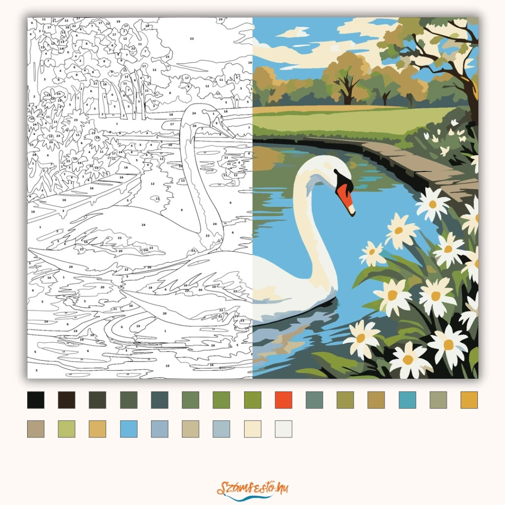 A képen két hattyú úszik csendesen egy kerti tavon, a víz felszínén lágy tükröződésekkel. A partot margaréták, zöld növények és egy kanyargó kőszegély keretezi. A tavaszi park és a felhős ég nyugodt, romantikus hangulatot ad a jelenetnek. Varázsolj egyedi hangulatot otthonodba ezzel a gyönyörű számfestő készlettel, amely tökéletes ajándék is lehet szeretteid számára. A csomag mindent tartalmaz, amire szükséged van ahhoz, hogy saját kezűleg alkoss egy lenyűgöző festményt.
