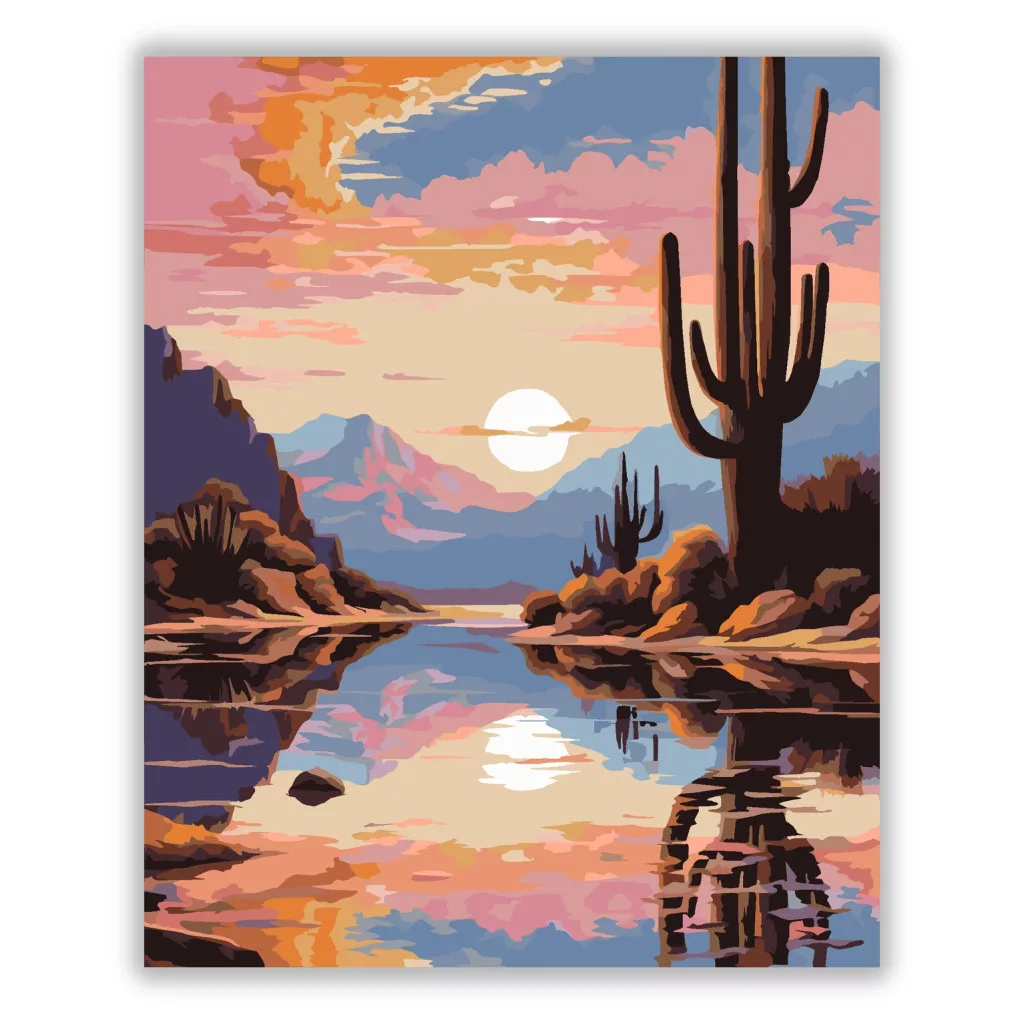 A képen egy nyugodt tó látható, amely a narancsos égboltot és a napot tükrözi. A parton magas kaktuszok és sziklás dombok állnak, a távolban hegyek rajzolódnak ki. A rózsaszínes felhők és a meleg fények békés, sivatagi hangulatot teremtenek. Ez a számfestő készlet tökéletes választás, ha egyedi dekorációval tennéd szebbé otthonodat, vagy ha különleges ajándékot keresel. A csomagban minden megtalálható, amire a festéshez szükséged van.