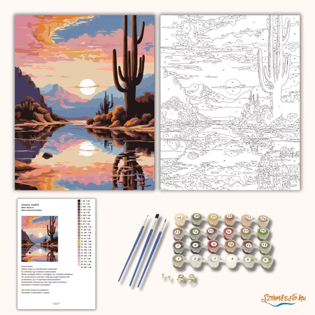 A képen egy nyugodt tó látható, amely a narancsos égboltot és a napot tükrözi. A parton magas kaktuszok és sziklás dombok állnak, a távolban hegyek rajzolódnak ki. A rózsaszínes felhők és a meleg fények békés, sivatagi hangulatot teremtenek. Díszítsd otthonodat saját kézzel készített műalkotással, vagy ajándékozd meg szeretteidet egy igazán különleges élménnyel! A számfestő készletben minden szükséges eszköz megtalálható a festmény elkészítéséhez.