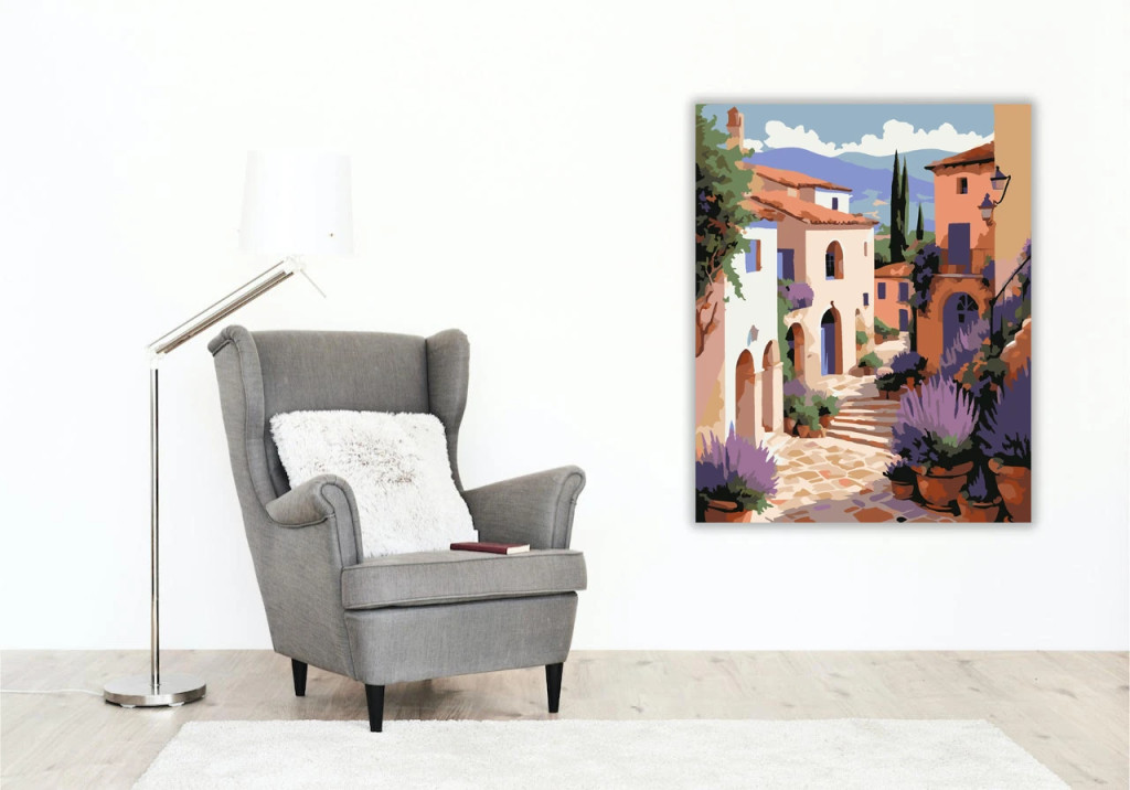 A képen egy hangulatos, szűk utca látható kőburkolattal és néhány lépcsőfokkal, két oldalt házakkal. A házak között magas, karcsú fák emelkednek, körülöttük bokrok és cserepes növények. A háttérben hegyek és felhők teszik nyugodttá a látványt, a kép meleg és lágy árnyalatokkal. Ez a számfestő készlet tökéletes választás, ha egyedi dekorációval tennéd szebbé otthonodat, vagy ha különleges ajándékot keresel. A csomagban minden megtalálható, amire a festéshez szükséged van.