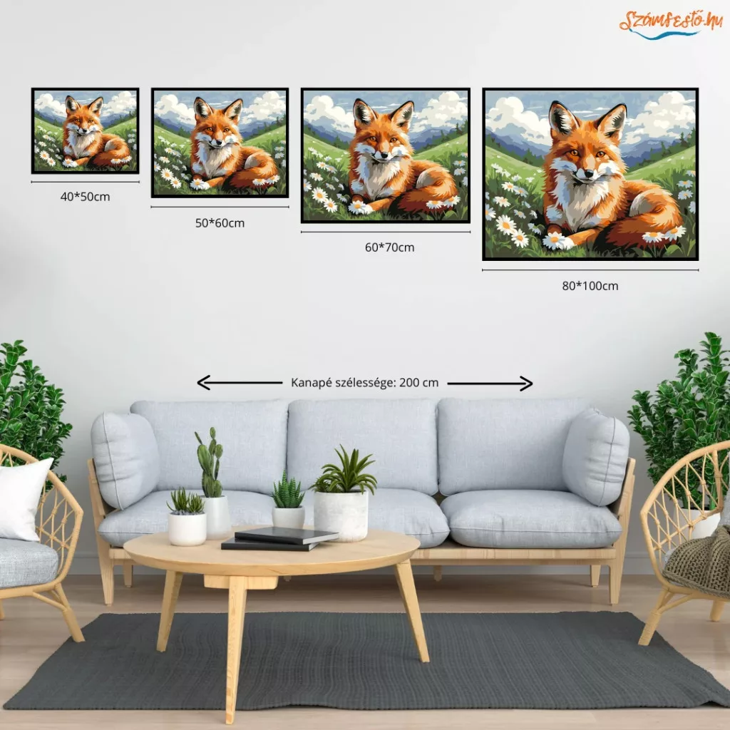 A képen egy vörös róka fekszik a fűben, körülötte fehér virágokkal. A háttérben dombok és távoli hegyek látszanak, felettük felhős ég. A látvány nyugodt, természetközeli hangulatot áraszt. Legyen a lakásod dísze vagy egy kedves meglepetés valaki számára – ez a számfestő készlet tökéletes választás mindkettőre. A készletben mindent megtalálsz, amivel lépésről lépésre megalkotható ez a gyönyörű festmény.