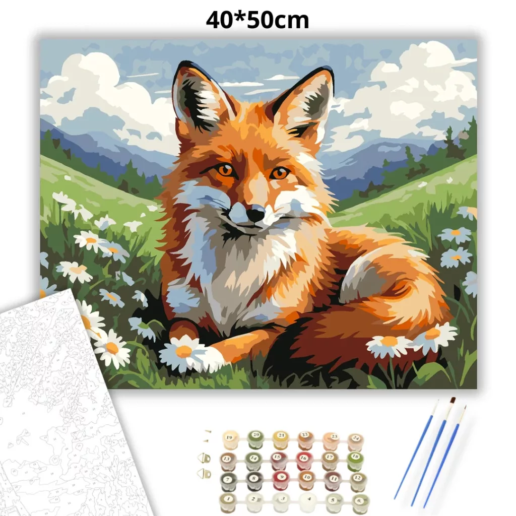 A képen egy vörös róka fekszik a fűben, körülötte fehér virágokkal. A háttérben dombok és távoli hegyek látszanak, felettük felhős ég. A látvány nyugodt, természetközeli hangulatot áraszt. Varázsolj egyedi hangulatot otthonodba ezzel a gyönyörű számfestő készlettel, amely tökéletes ajándék is lehet szeretteid számára. A csomag mindent tartalmaz, amire szükséged van ahhoz, hogy saját kezűleg alkoss egy lenyűgöző festményt.