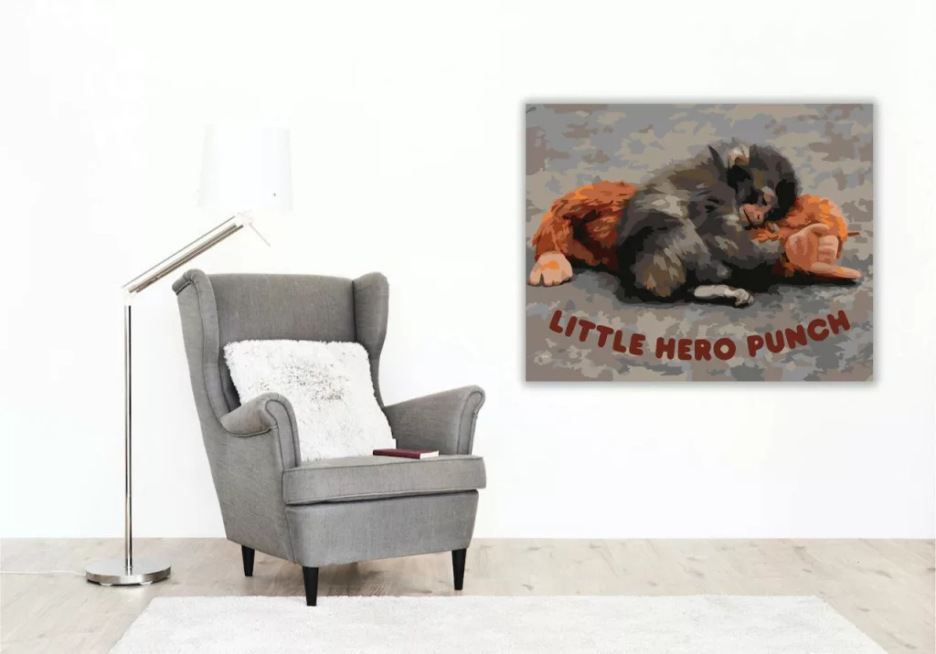 A festmény Punchot ábrázolja, amint határozottan magához húzza narancsszínű plüssmamáját, mintha a világ elől védené. Apró teste még törékeny, de az ölelés mozdulata már erőt és ragaszkodást sugall. A szürke háttér visszafogottsága kiemeli a plüss élénk narancs árnyalatait és a kismajom puha bundáját, így a kompozíció teljes figyelmet a kötődésre irányít. A virálisan ismert történet ezen pillanata azt az érzést testesíti meg, amikor egy magányos lélek végre talál valamit – vagy valakit –, akit nem akar többé elengedni. Legyen a lakásod dísze vagy egy kedves meglepetés valaki számára – ez a számfestő készlet tökéletes választás mindkettőre. A készletben mindent megtalálsz, amivel lépésről lépésre megalkotható ez a gyönyörű festmény.