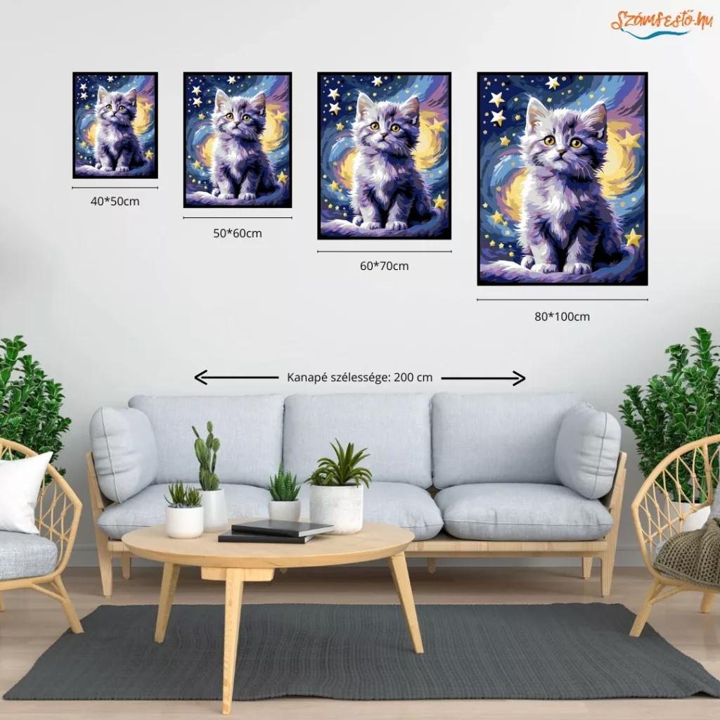 Bolyhos kiscica a csillagok alatt - számfestő készlet - Számfestő.hu - 40×50cm - Keret nélkül