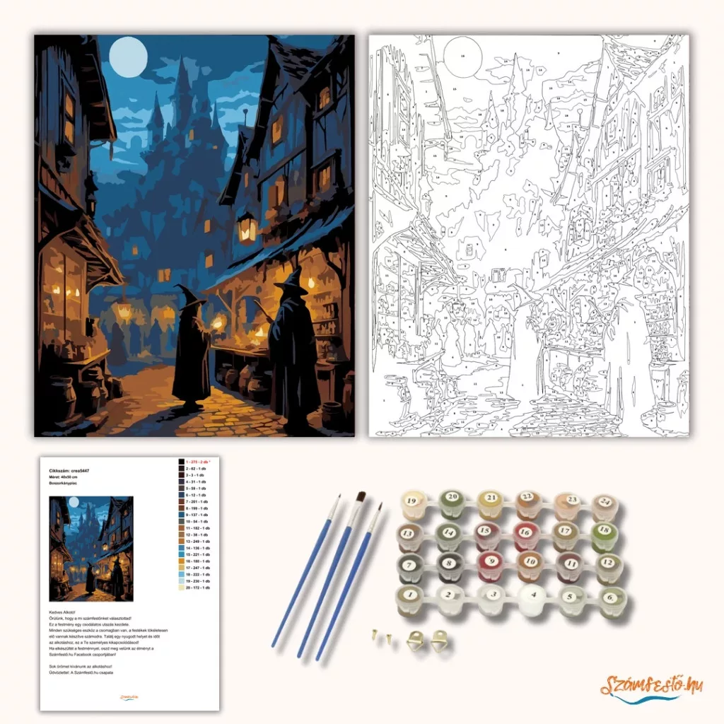 A képen egy boszorkánypiac látható alkonyatkor, holdfénnyel és meleg lámpásokkal megvilágított utcán. A bódékban világító főzetek sorakoznak, a háttérben pedig egy magas, tornyos kastély rajzolódik ki. A tömegben csuklyás alakok és seprűk is feltűnnek, amitől az egész jelenet titokzatos és varázslatos hangulatú. Ez a számfestő készlet tökéletes választás, ha egyedi dekorációval tennéd szebbé otthonodat, vagy ha különleges ajándékot keresel. A csomagban minden megtalálható, amire a festéshez szükséged van.