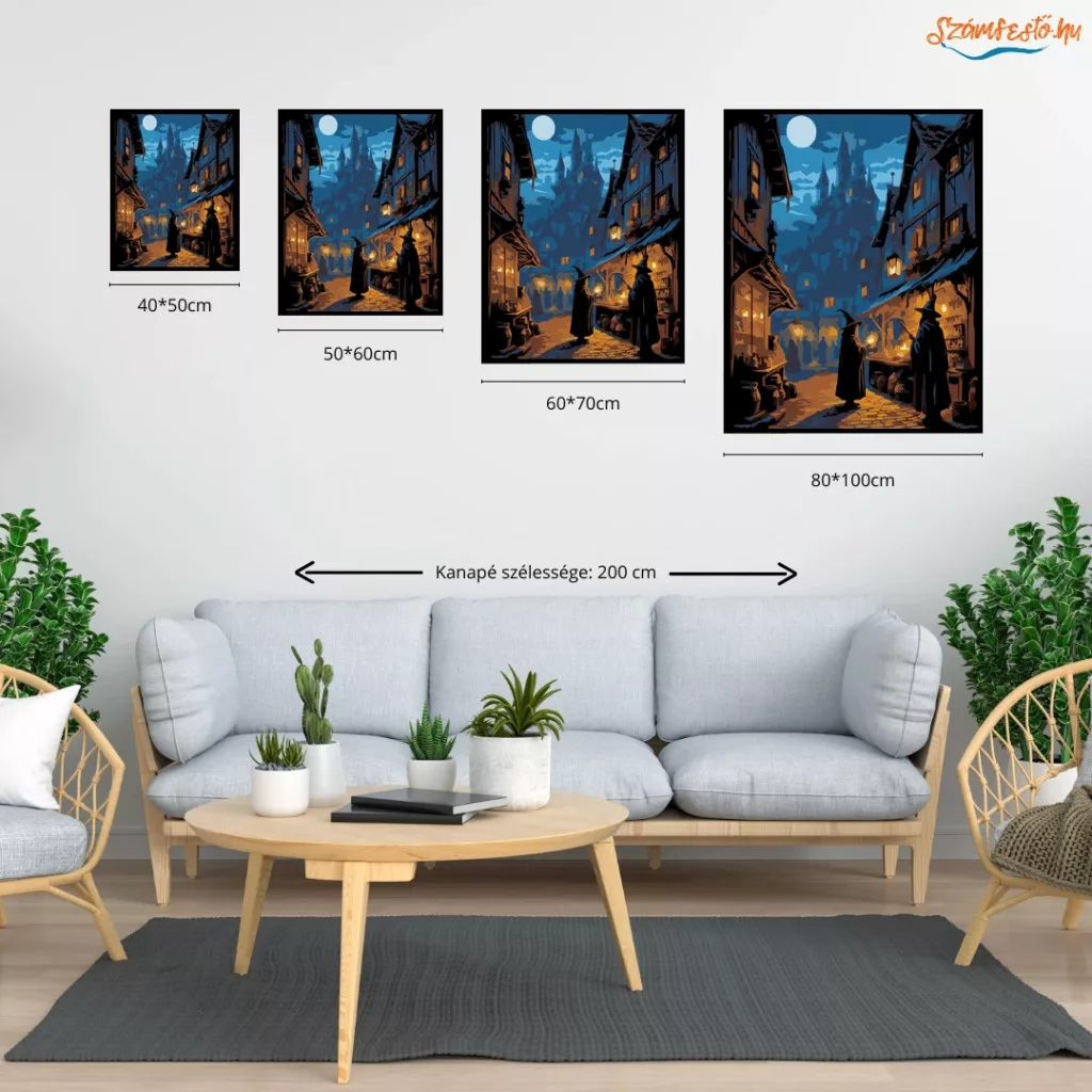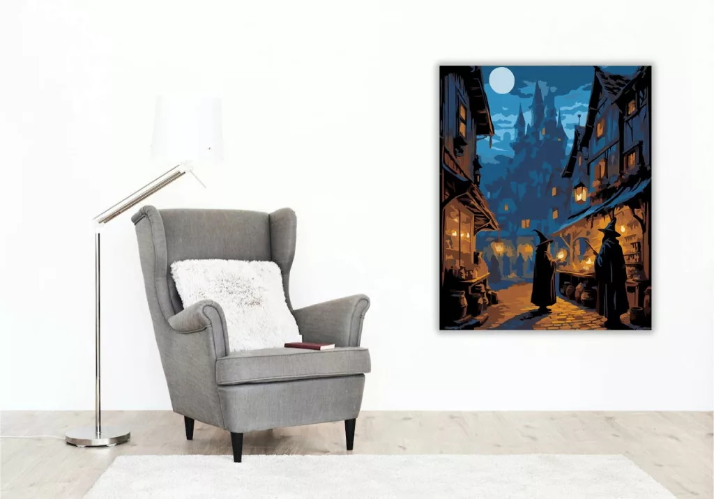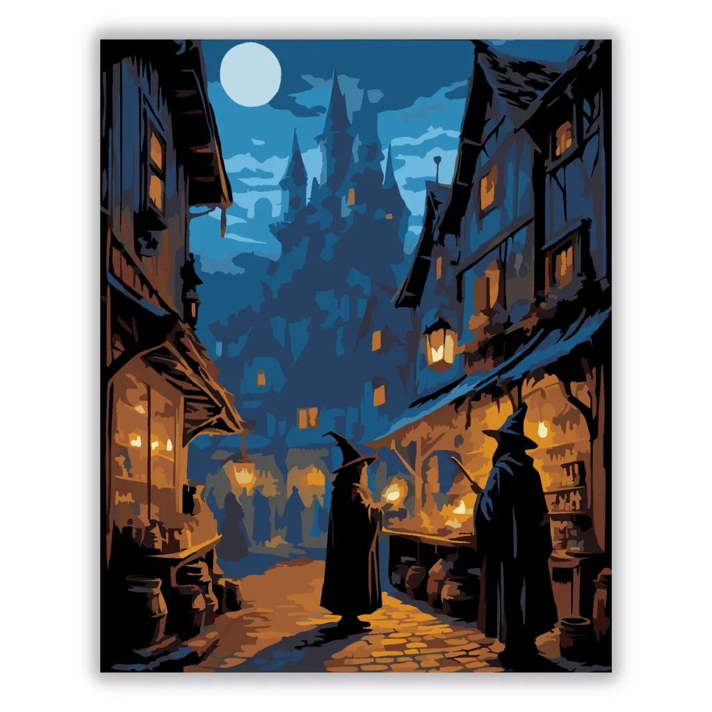 A képen egy boszorkánypiac látható alkonyatkor, holdfénnyel és meleg lámpásokkal megvilágított utcán. A bódékban világító főzetek sorakoznak, a háttérben pedig egy magas, tornyos kastély rajzolódik ki. A tömegben csuklyás alakok és seprűk is feltűnnek, amitől az egész jelenet titokzatos és varázslatos hangulatú. Varázsolj egyedi hangulatot otthonodba ezzel a gyönyörű számfestő készlettel, amely tökéletes ajándék is lehet szeretteid számára. A csomag mindent tartalmaz, amire szükséged van ahhoz, hogy saját kezűleg alkoss egy lenyűgöző festményt.