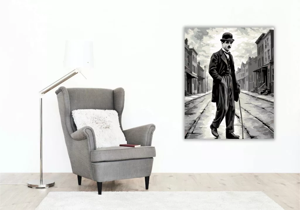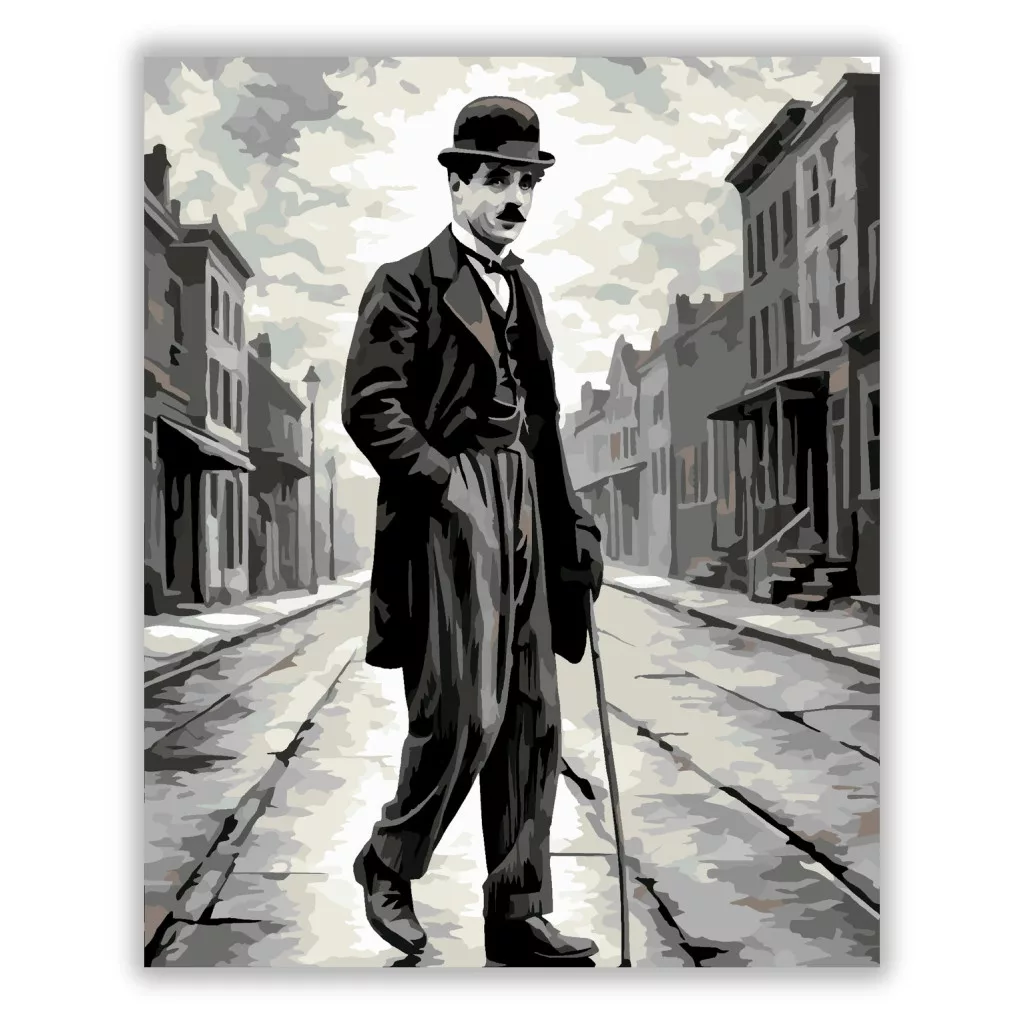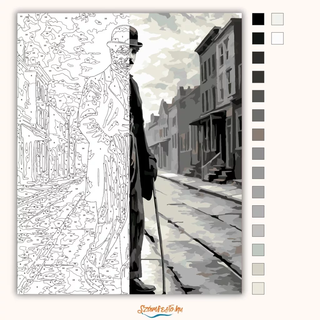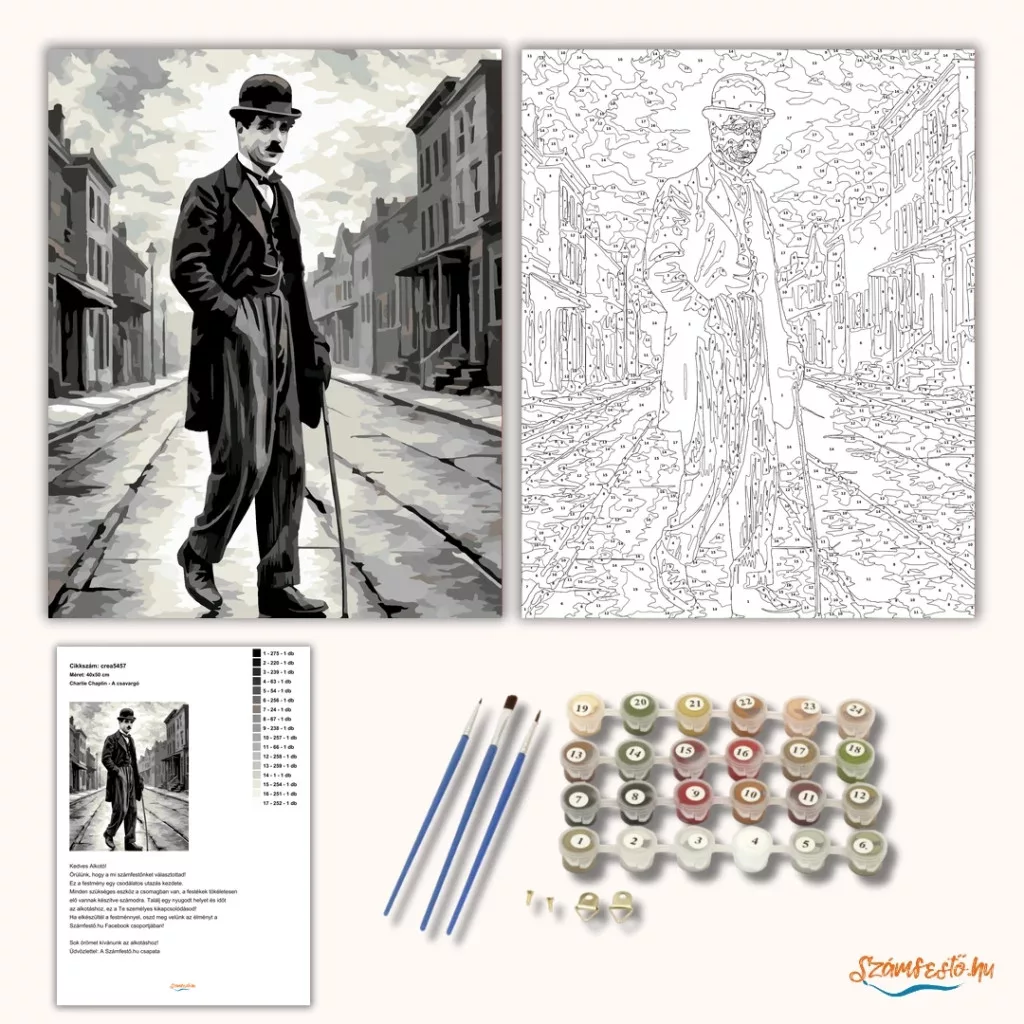A képen Charlie Chaplin ikonikus „Csavargó” karaktere látható, jellegzetes keménykalapban, bottal a kezében, egy üres utcán sétálva. A fekete-fehér stílus nosztalgikus hangulatot teremt, miközben a városi háttér egyszerűsége kiemeli a figura magányos, mégis könnyed jelenlétét. Az alak finom humort és melankóliát sugároz, tökéletesen megidézve a némafilmek korszakának hangulatát. Ez a számfestő készlet tökéletes választás, ha egyedi dekorációval tennéd szebbé otthonodat, vagy ha különleges ajándékot keresel. A csomagban minden megtalálható, amire a festéshez szükséged van.
