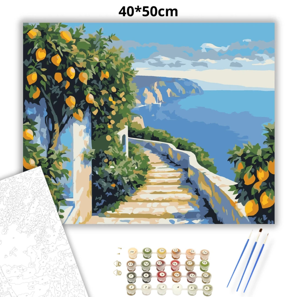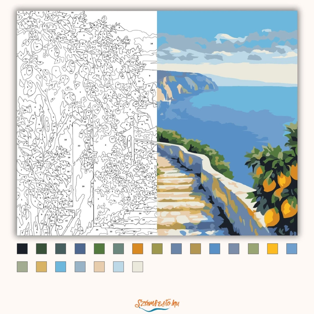 A képen egy lépcsős ösvény látható fehér korláttal, amely a tenger felé vezet. Az út mentén citromfák és sűrű zöld növényzet keretezi a látványt. A távolban sziklás part és nyugodt, kék víz látszik a felhős ég alatt. Legyen a lakásod dísze vagy egy kedves meglepetés valaki számára – ez a számfestő készlet tökéletes választás mindkettőre. A készletben mindent megtalálsz, amivel lépésről lépésre megalkotható ez a gyönyörű festmény.