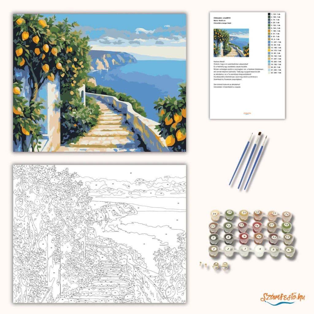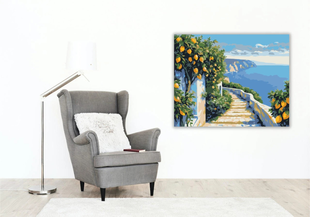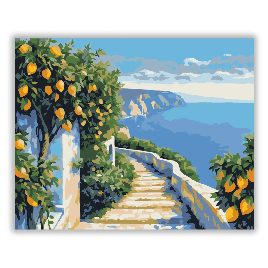 A képen egy lépcsős ösvény látható fehér korláttal, amely a tenger felé vezet. Az út mentén citromfák és sűrű zöld növényzet keretezi a látványt. A távolban sziklás part és nyugodt, kék víz látszik a felhős ég alatt. Legyen a lakásod dísze vagy egy kedves meglepetés valaki számára – ez a számfestő készlet tökéletes választás mindkettőre. A készletben mindent megtalálsz, amivel lépésről lépésre megalkotható ez a gyönyörű festmény.