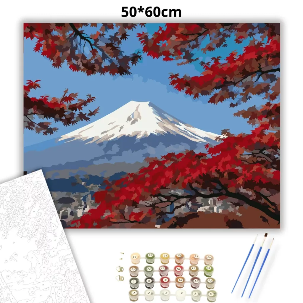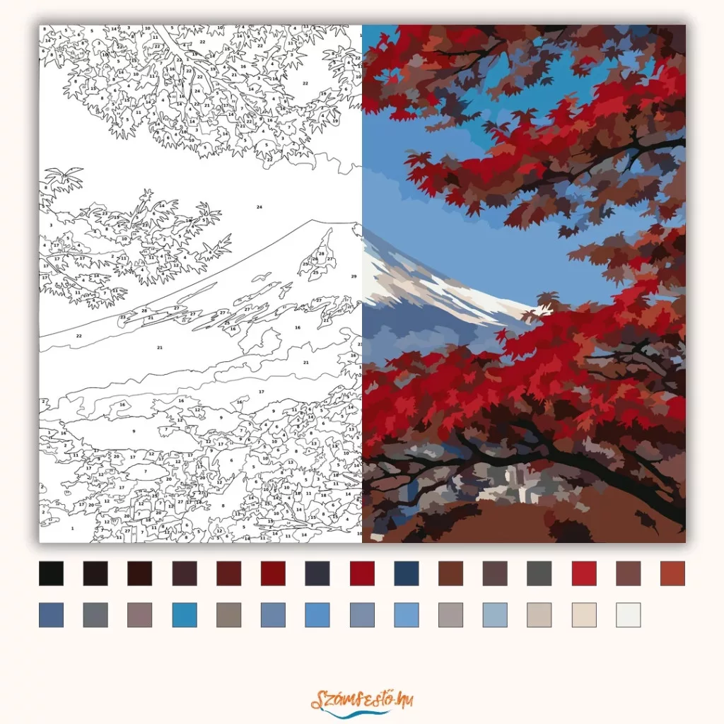 A képen a hófödte Fudzsi-hegy látható a távolban, tiszta ég alatt. Az előtérben vöröses juharlevelek és ágak keretezik a látványt, alul pedig egy város körvonalai sejlenek fel. Nyugodt, őszi hangulatú kép, látványos hegycsúccsal a középpontban. Legyen a lakásod dísze vagy egy kedves meglepetés valaki számára – ez a számfestő készlet tökéletes választás mindkettőre. A készletben mindent megtalálsz, amivel lépésről lépésre megalkotható ez a gyönyörű festmény.