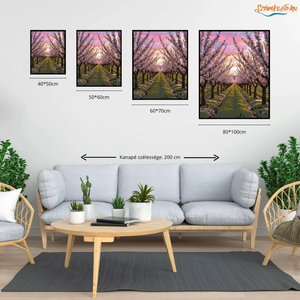 A képen egy virágzó gyümölcsös fasor látható, ahol a fák lombja alagútszerűen borul a földútra. A rózsaszínes-lilás virágok és a puha, pasztelles égbolt nyugodt, tavaszi hangulatot adnak. A sorok közti zöld sávok a távolba vezetik a tekintetet, mintha egy csendes sétára hívnának. Varázsolj egyedi hangulatot otthonodba ezzel a gyönyörű számfestő készlettel, amely tökéletes ajándék is lehet szeretteid számára. A csomag mindent tartalmaz, amire szükséged van ahhoz, hogy saját kezűleg alkoss egy lenyűgöző festményt.