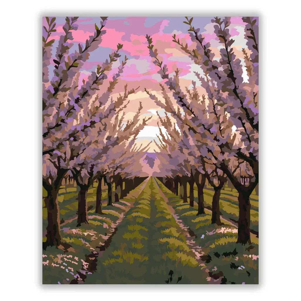 A képen egy virágzó gyümölcsös fasor látható, ahol a fák lombja alagútszerűen borul a földútra. A rózsaszínes-lilás virágok és a puha, pasztelles égbolt nyugodt, tavaszi hangulatot adnak. A sorok közti zöld sávok a távolba vezetik a tekintetet, mintha egy csendes sétára hívnának. Engedd szabadjára a kreativitásodat, és alkoss egy különleges műalkotást, amely otthonod dísze lehet de egyedi ajándékként is kiváló. A számfestő készletben minden szükséges eszközt megtalálsz a tökéletes végeredményhez.