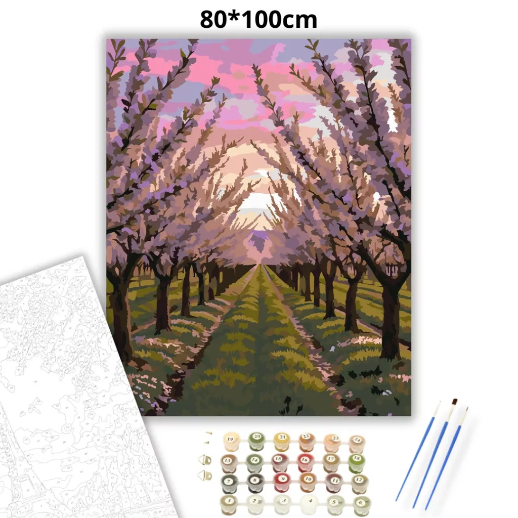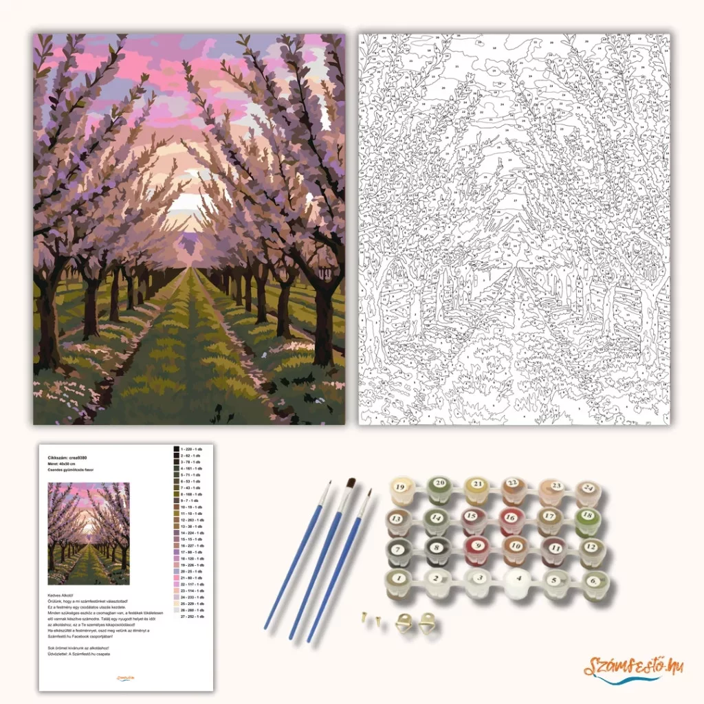 A képen egy virágzó gyümölcsös fasor látható, ahol a fák lombja alagútszerűen borul a földútra. A rózsaszínes-lilás virágok és a puha, pasztelles égbolt nyugodt, tavaszi hangulatot adnak. A sorok közti zöld sávok a távolba vezetik a tekintetet, mintha egy csendes sétára hívnának. Engedd szabadjára a kreativitásodat, és alkoss egy különleges műalkotást, amely otthonod dísze lehet de egyedi ajándékként is kiváló. A számfestő készletben minden szükséges eszközt megtalálsz a tökéletes végeredményhez.