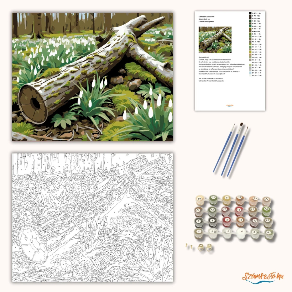 A képen tavaszi erdőrészlet látható, ahol a talajszintről nézve hóvirágok nyílnak egy régi, mohával borított kidőlt fatörzs mellett. A friss zöldek és a fehér virágok nyugodt, üde hangulatot adnak. A háttérben erdei fák és a lombos aljnövényzet teszi teljessé a természetközeli látványt. Legyen a lakásod dísze vagy egy kedves meglepetés valaki számára – ez a számfestő készlet tökéletes választás mindkettőre. A készletben mindent megtalálsz, amivel lépésről lépésre megalkotható ez a gyönyörű festmény.