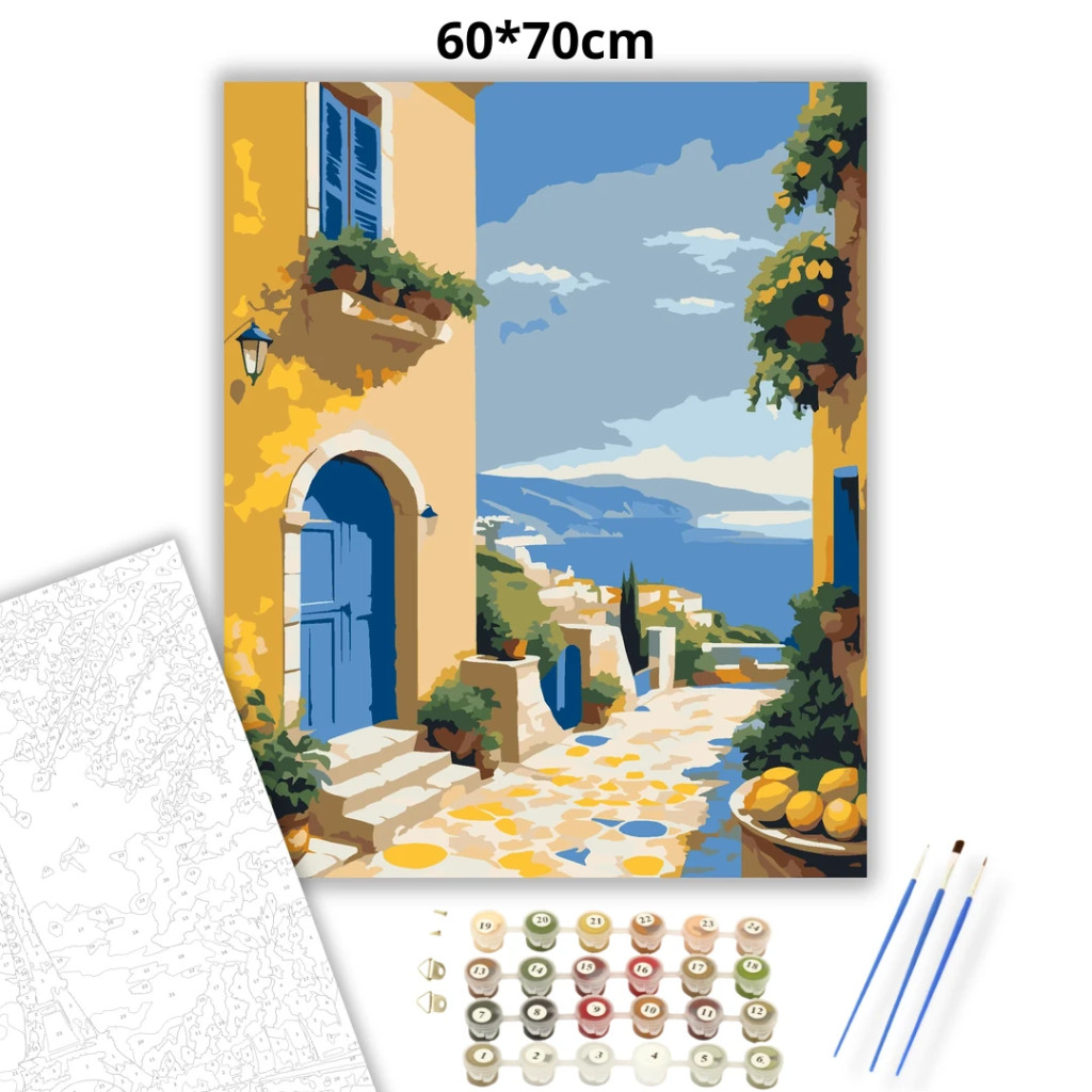 A képen egy napsütötte, tengerre néző kis utcácska látható, kék ajtóval és kék zsalugáteres ablakkal. A kanyargó, köves út a távoli házak és a víz felé vezet, felette felhős égbolt. A jelenetet cserepes növények és citromok teszik otthonossá és nyugodttá. Díszítsd otthonodat saját kézzel készített műalkotással, vagy ajándékozd meg szeretteidet egy igazán különleges élménnyel! A számfestő készletben minden szükséges eszköz megtalálható a festmény elkészítéséhez.