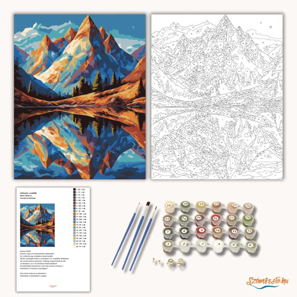 A képen egy hegyvonulat látható egy csendes tó partján, ahol a csúcsok tükörképe szinte tökéletesen visszaverődik a vízen. A látvány álomszerű, mintha egy színes kaleidoszkóp rajzolná újra a hegyeket és a partot. A fenyők sötét sziluettje és a ragyogó hegyoldalak együtt nyugodt, mégis látványos hangulatot adnak. Díszítsd otthonodat saját kézzel készített műalkotással, vagy ajándékozd meg szeretteidet egy igazán különleges élménnyel! A számfestő készletben minden szükséges eszköz megtalálható a festmény elkészítéséhez.