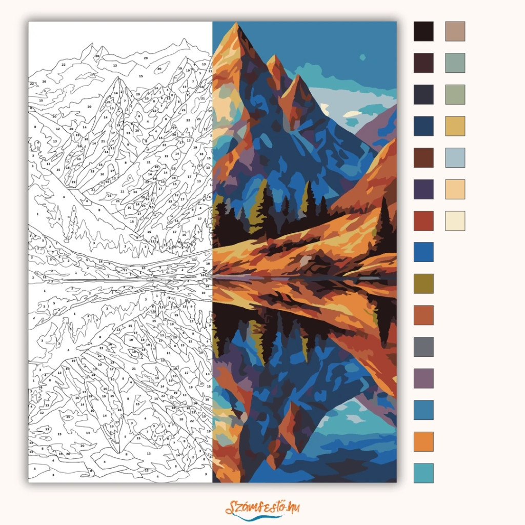 A képen egy hegyvonulat látható egy csendes tó partján, ahol a csúcsok tükörképe szinte tökéletesen visszaverődik a vízen. A látvány álomszerű, mintha egy színes kaleidoszkóp rajzolná újra a hegyeket és a partot. A fenyők sötét sziluettje és a ragyogó hegyoldalak együtt nyugodt, mégis látványos hangulatot adnak. Legyen a lakásod dísze vagy egy kedves meglepetés valaki számára – ez a számfestő készlet tökéletes választás mindkettőre. A készletben mindent megtalálsz, amivel lépésről lépésre megalkotható ez a gyönyörű festmény.