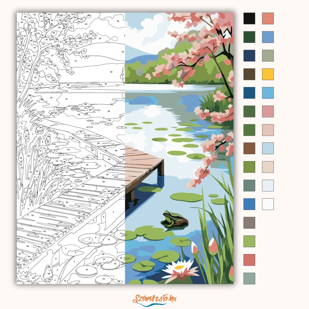 A képen egy fa stég nyúlik be a tükörsima tavaszi tóba, a vízen tavirózsa levelekkel és virágokkal. A partot nádas és virágzó fák keretezik, a távolban dombok és felhők látszanak. Nyugodt, friss hangulatú látvány, amely pihenésre és elcsendesedésre hív. Ez a számfestő készlet tökéletes választás, ha egyedi dekorációval tennéd szebbé otthonodat, vagy ha különleges ajándékot keresel. A csomagban minden megtalálható, amire a festéshez szükséged van.